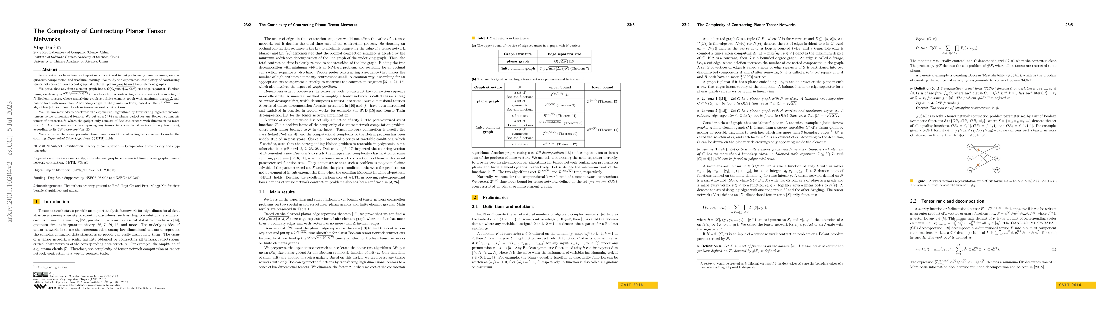 This paper investigates the complexity of contracting tensor networks on planar and finite element graphs, presenting a $2^{O(d\sqrt{\max\{\Delta,d\}N})}$ time algorithm for such networks. The authors also propose methods to accelerate the contraction process by reducing tensor dimensions and establish a sub-exponential time lower bound under the Exponential Time Hypothesis.