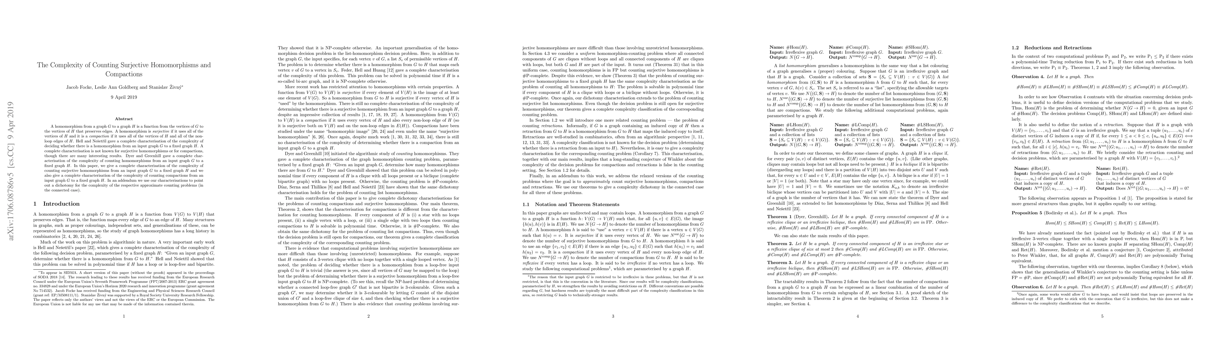 A homomorphism from a graph G to a graph H is a function from the vertices of G to the vertices of H that preserves edges. A homomorphism is surjective if it uses all of the vertices of H and it is a compaction if it uses all of the vertices of H and all of the non-loop edges of H. Hell and Nesetril gave a complete characterisation of the complexity of deciding whether there is a homomorphism from an input graph G to a fixed graph H. A complete characterisation is not known for surjective homomorphisms or for compactions, though there are many interesting results. Dyer and Greenhill gave a complete characterisation of the complexity of counting homomorphisms from an input graph G to a fixed graph H. In this paper, we give a complete characterisation of the complexity of counting surjective homomorphisms from an input graph G to a fixed graph H and we also give a complete characterisation of the complexity of counting compactions from an input graph G to a fixed graph H. In an addendum we use our characterisations to point out a dichotomy for the complexity of the respective approximate counting problems (in the connected case).