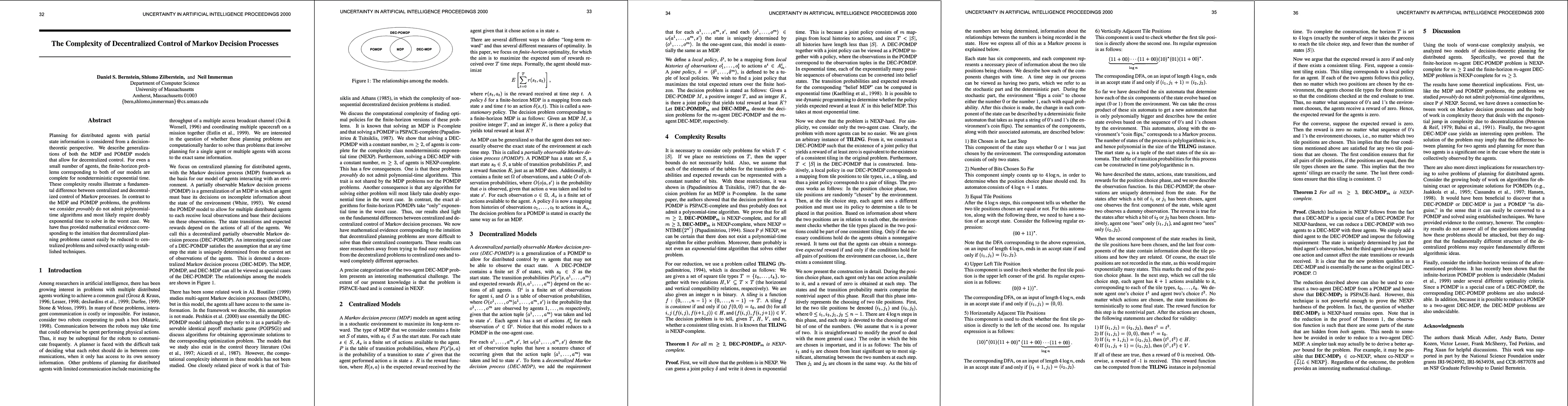 Planning for distributed agents with partial state information is considered from a decision- theoretic perspective. We describe generalizations of both the MDP and POMDP models that allow for decentralized control. For even a small number of agents, the finite-horizon problems corresponding to both of our models are complete for nondeterministic exponential time. These complexity results illustrate a fundamental difference between centralized and decentralized control of Markov processes. In contrast to the MDP and POMDP problems, the problems we consider provably do not admit polynomial-time algorithms and most likely require doubly exponential time to solve in the worst case. We have thus provided mathematical evidence corresponding to the intuition that decentralized planning problems cannot easily be reduced to centralized problems and solved exactly using established techniques.