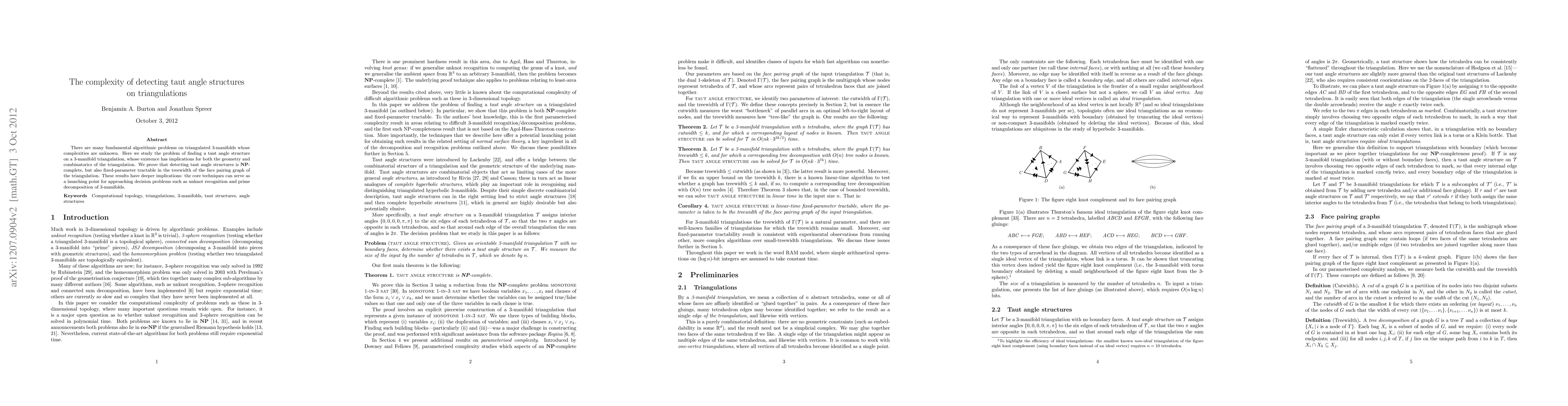 This paper demonstrates that detecting taut angle structures on triangulations of 3-manifolds is NP-complete but can be solved efficiently relative to the treewidth of the face pairing graph. The findings suggest potential applications in tackling complex problems like unknot recognition and prime decomposition.
