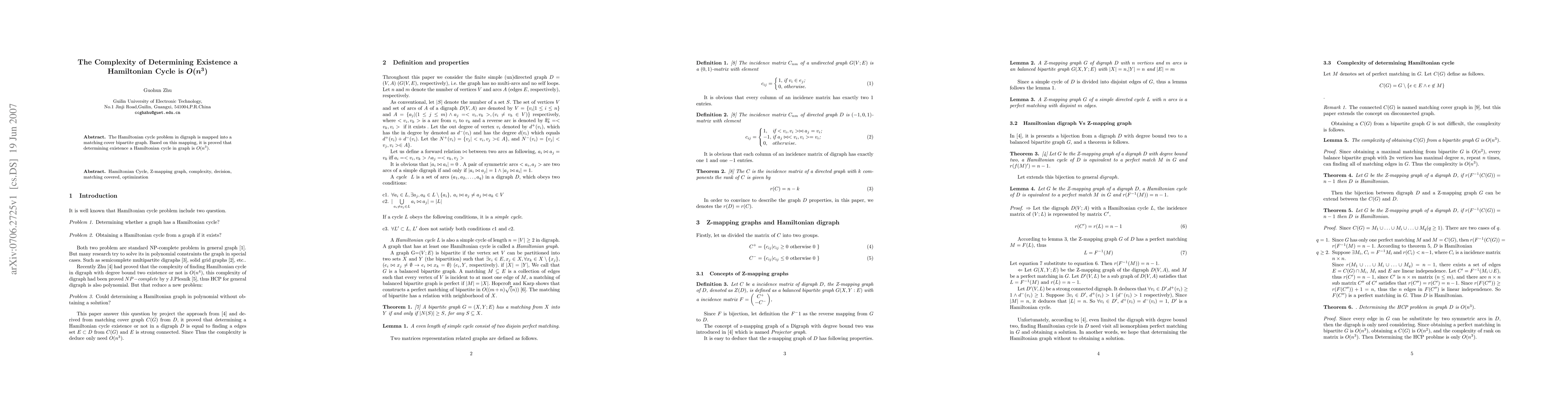 Summary: This paper demonstrates a method to transform the Hamiltonian cycle problem in directed graphs into a matching cover problem in bipartite graphs, proving that the existence of a Hamiltonian cycle can be determined in $O(n^3)$ time complexity.