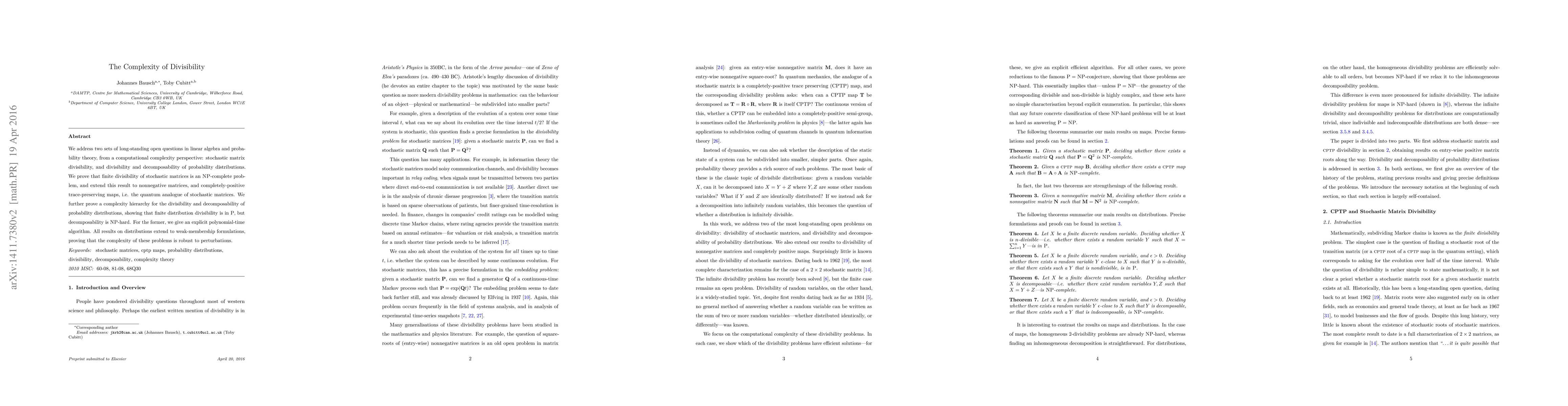 We address two sets of long-standing open questions in probability theory, from a computational complexity perspective: divisibility of stochastic maps, and divisibility and decomposability of probability distributions. We prove that finite divisibility of stochastic maps is an NP-complete problem, and extend this result to nonnegative matrices, and completely-positive trace-preserving maps, i.e. the quantum analogue of stochastic maps. We further prove a complexity hierarchy for the divisibility and decomposability of probability distributions, showing that finite distribution divisibility is in P, but decomposability is NP-hard. For the former, we give an explicit polynomial-time algorithm. All results on distributions extend to weak-membership formulations, proving that the complexity of these problems is robust to perturbations.