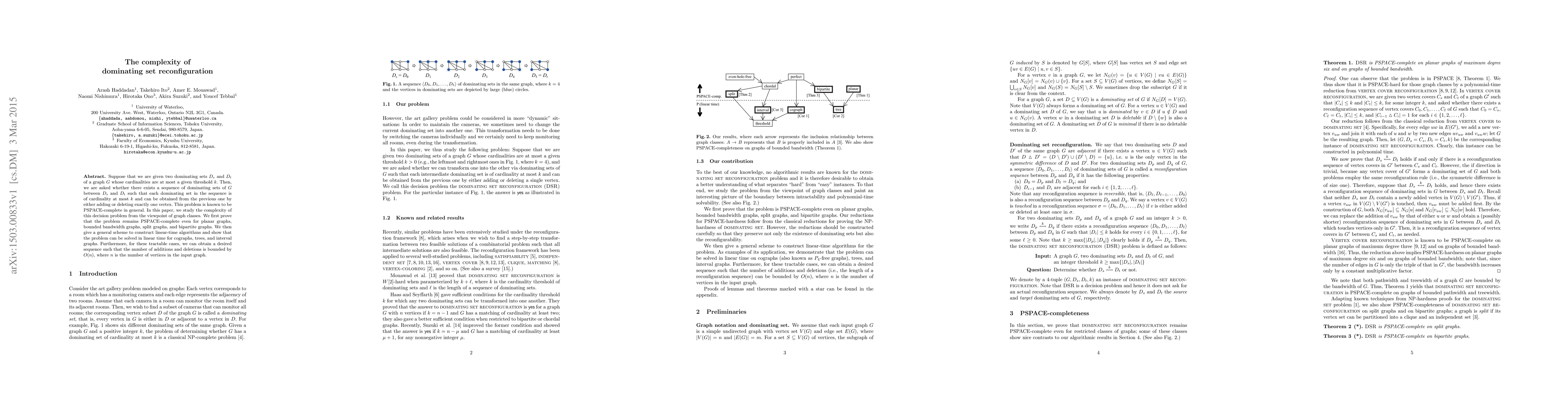 This paper investigates the complexity of reconfiguring dominating sets in various graph classes. It proves that the problem remains PSPACE-complete for planar, bounded bandwidth, split, and bipartite graphs, while presenting linear-time algorithms for cographs, trees, and interval graphs, with solutions involving at most $O(n)$ additions or deletions.