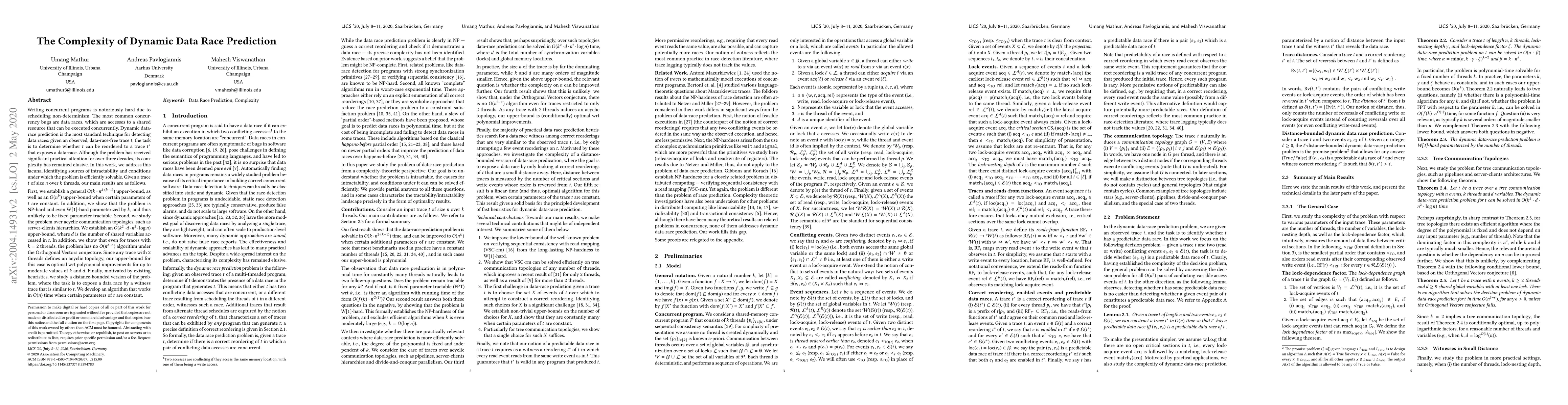 This paper investigates the complexity of dynamic data race prediction in concurrent programs, establishing upper bounds and demonstrating NP-hardness. It provides efficient solutions under certain conditions and proves the problem's intractability for general cases.