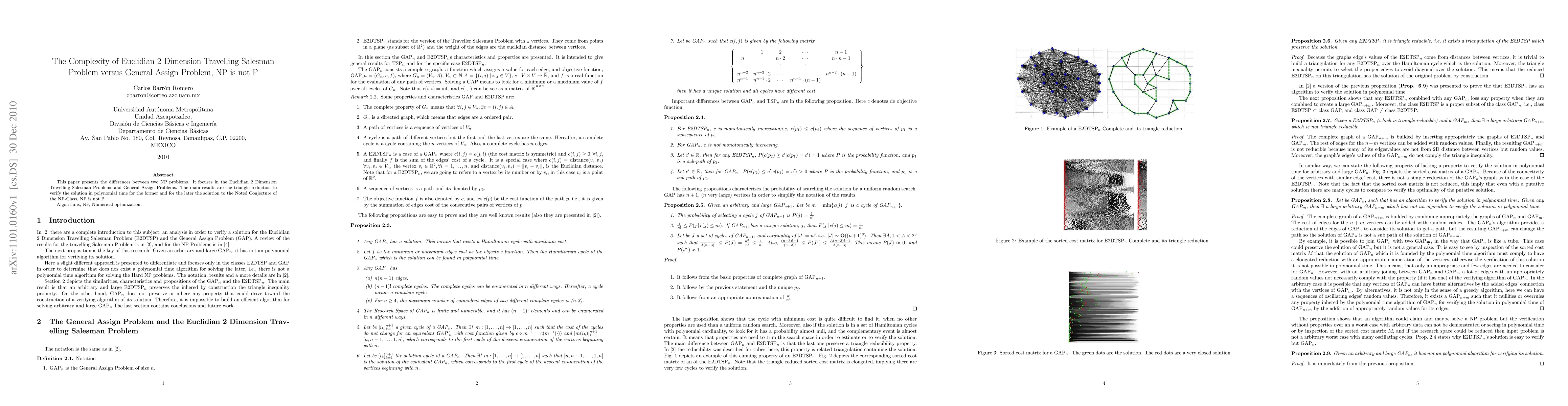 This paper presents the differences between two NP problems. It focuses in the Euclidian 2 Dimension Travelling Salesman Problems and General Assign Problems. The main results are the triangle reduction to verify the solution in polynomial time for the former and for the later the solution to the Noted Conjecture of the NP-Class, NP is not P.