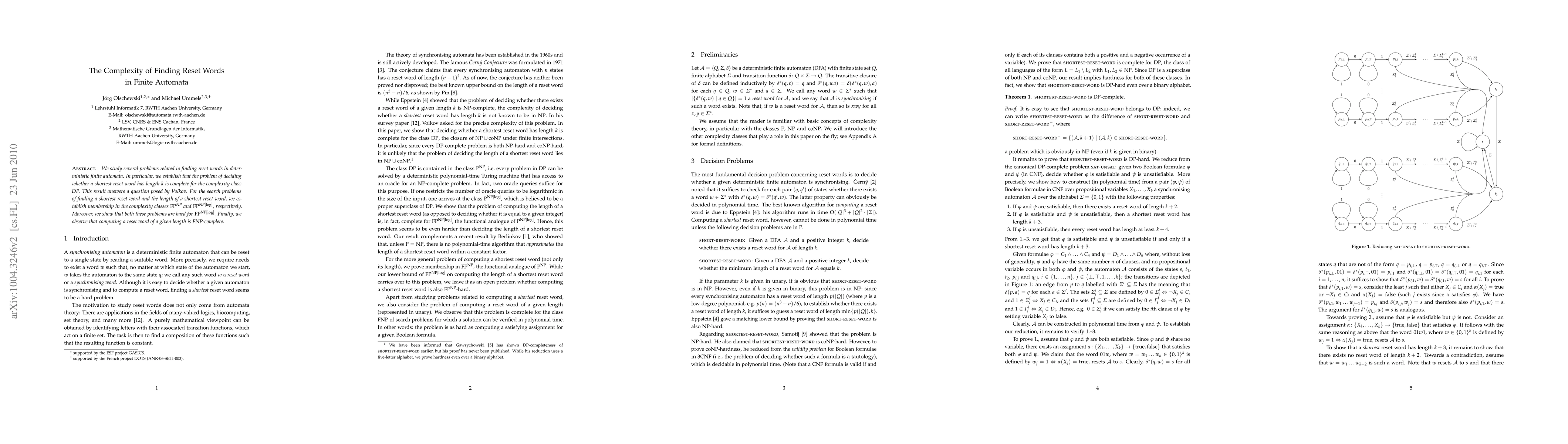 The paper investigates the complexity of determining reset words in deterministic finite automata, proving that deciding the length of the shortest reset word is DP-complete. It also classifies finding the shortest reset word and its length in FP^NP and FP^NP[log] respectively, and shows both problems are hard for FP^NP[log]. Additionally, computing a reset word of a given length is established as FNP-complete.