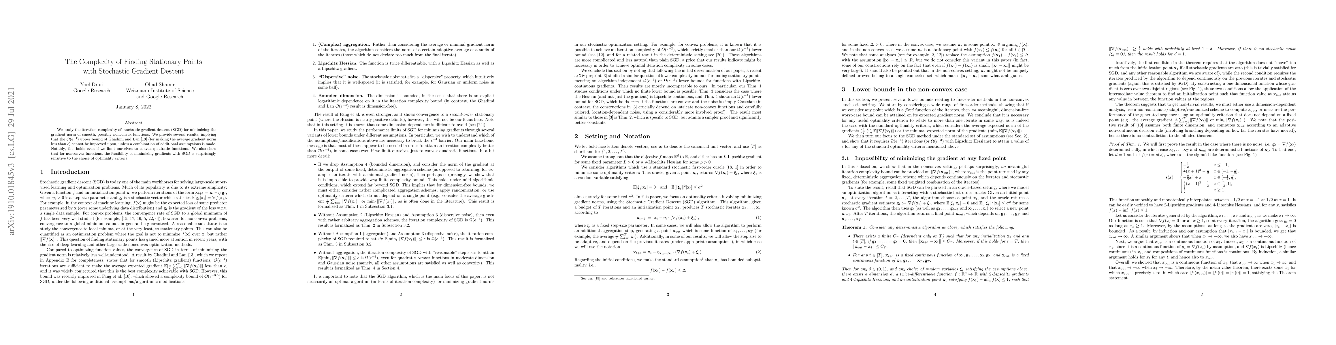We study the iteration complexity of stochastic gradient descent (SGD) for minimizing the gradient norm of smooth, possibly nonconvex functions. We provide several results, implying that the $\mathcal{O}(\epsilon^{-4})$ upper bound of Ghadimi and Lan~\cite{ghadimi2013stochastic} (for making the average gradient norm less than $\epsilon$) cannot be improved upon, unless a combination of additional assumptions is made. Notably, this holds even if we limit ourselves to convex quadratic functions. We also show that for nonconvex functions, the feasibility of minimizing gradients with SGD is surprisingly sensitive to the choice of optimality criteria.