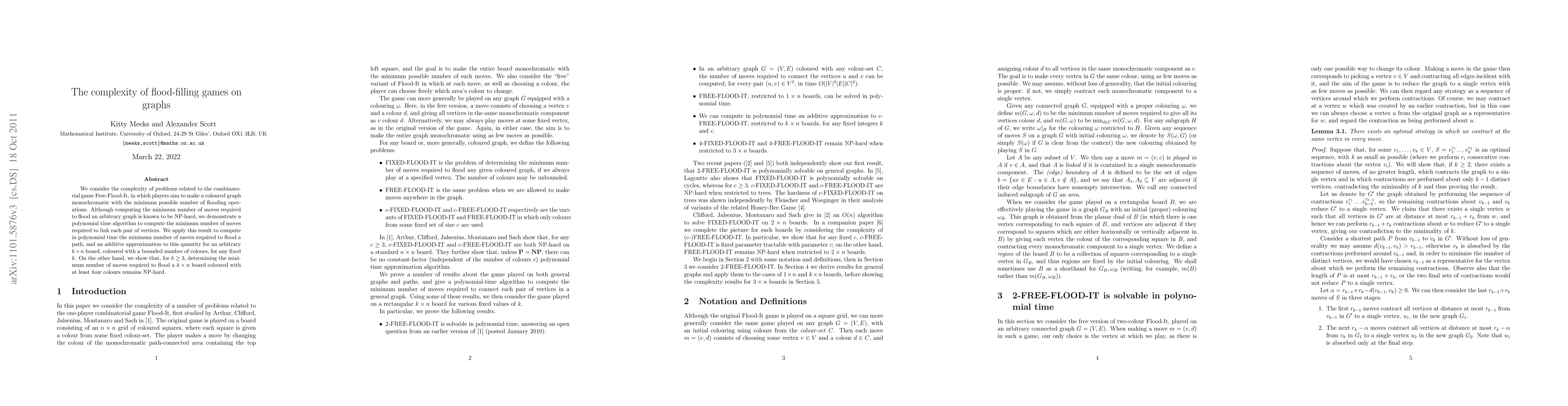 The paper analyzes the complexity of flood-filling games on graphs, specifically focusing on the Free-Flood-It game. It uses graph theory and computational complexity techniques to demonstrate polynomial-time algorithms for certain variants of the problem and proves NP-hardness for others.