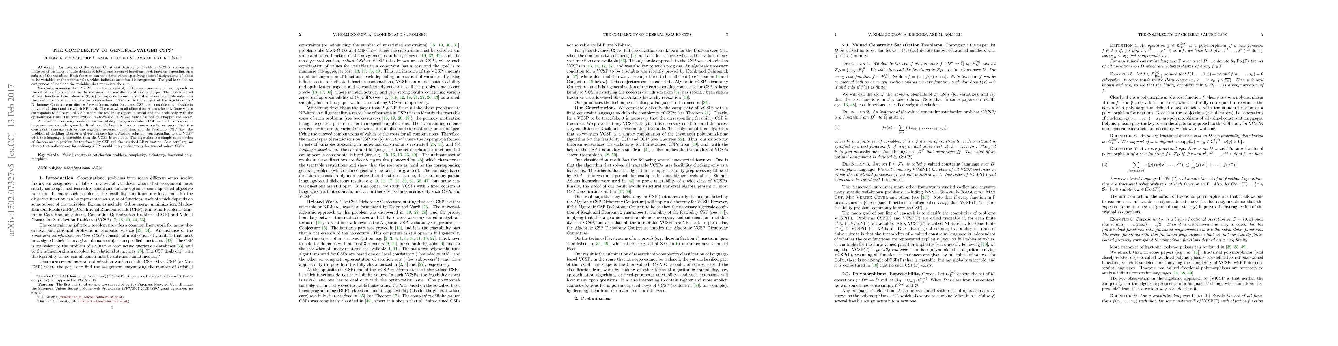 This paper investigates the complexity of Valued Constraint Satisfaction Problems (VCSPs) based on the allowed functions, termed the constraint language. It proves that if a constraint language meets a recent algebraic necessary condition and the corresponding feasibility CSP is tractable, then the VCSP is also tractable, using a combination of feasibility CSP algorithms and LP relaxation. The study implies that a dichotomy for ordinary CSPs would extend to general-valued CSPs.
