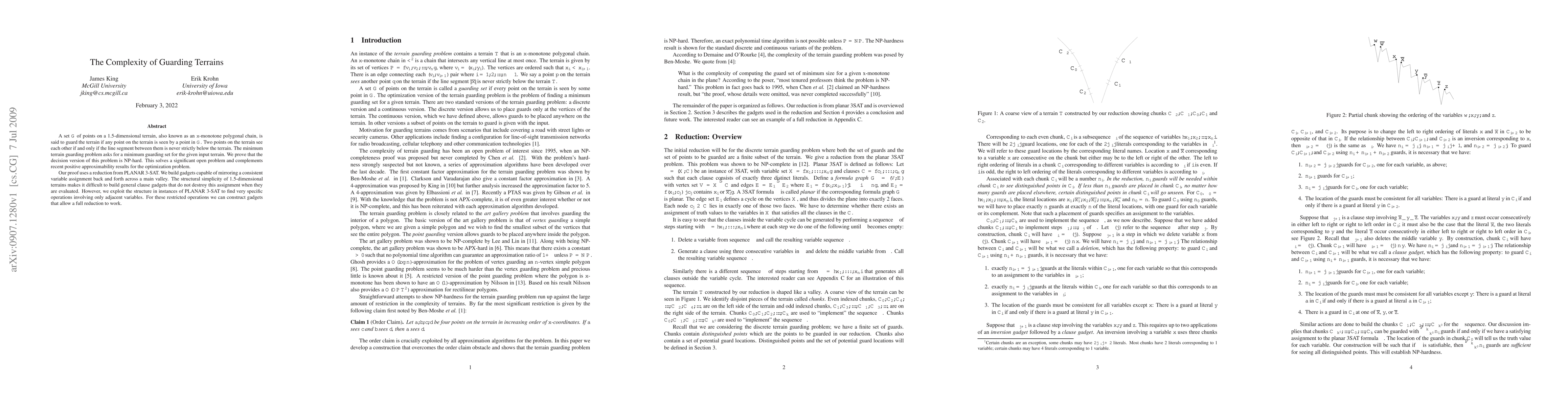 A set $G$ of points on a 1.5-dimensional terrain, also known as an $x$-monotone polygonal chain, is said to guard the terrain if any point on the terrain is 'seen' by a point in $G$. Two points on the terrain see each other if and only if the line segment between them is never strictly below the terrain. The minimum terrain guarding problem asks for a minimum guarding set for the given input terrain. We prove that the decision version of this problem is NP-hard. This solves a significant open problem and complements recent positive approximability results for the optimization problem. Our proof uses a reduction from PLANAR 3-SAT. We build gadgets capable of 'mirroring' a consistent variable assignment back and forth across a main valley. The structural simplicity of 1.5-dimensional terrains makes it difficult to build general clause gadgets that do not destroy this assignment when they are evaluated. However, we exploit the structure in instances of PLANAR 3-SAT to find very specific operations involving only 'adjacent' variables. For these restricted operations we can construct gadgets that allow a full reduction to work.