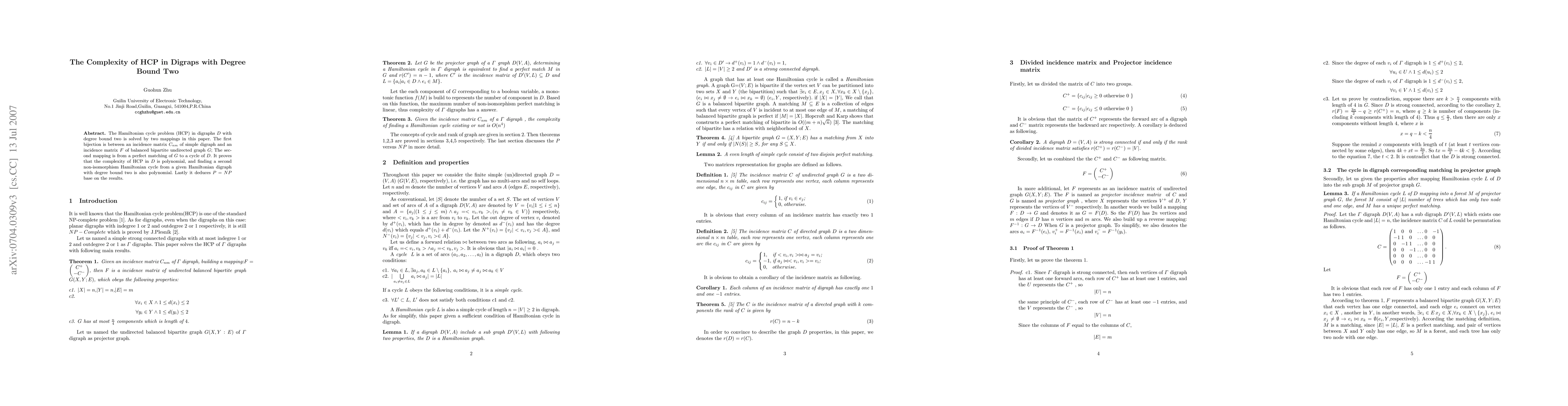 The Hamiltonian cycle problem (HCP) in digraphs D with degree bound two is solved by two mappings in this paper. The first bijection is between an incidence matrix C_{nm} of simple digraph and an incidence matrix F of balanced bipartite undirected graph G; The second mapping is from a perfect matching of G to a cycle of D. It proves that the complexity of HCP in D is polynomial, and finding a second non-isomorphism Hamiltonian cycle from a given Hamiltonian digraph with degree bound two is also polynomial. Lastly it deduces P=NP base on the results.