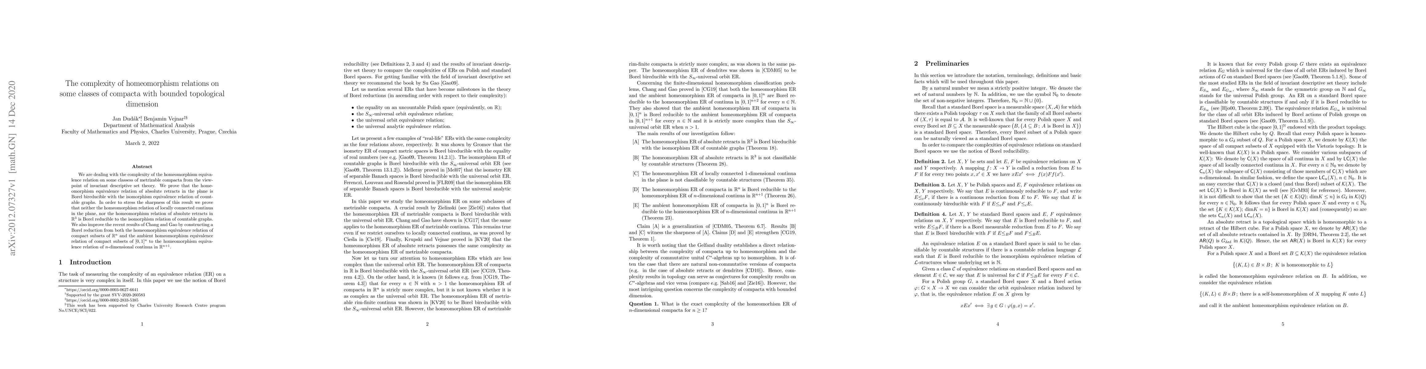 This paper investigates the complexity of homeomorphism relations on specific classes of metrizable compacta, using descriptive set theory. It demonstrates that the homeomorphism equivalence relation of absolute retracts in the plane is Borel bireducible with the isomorphism relation of countable graphs, while showing that certain other homeomorphism relations in different dimensions are not Borel reducible to the graph isomorphism relation.