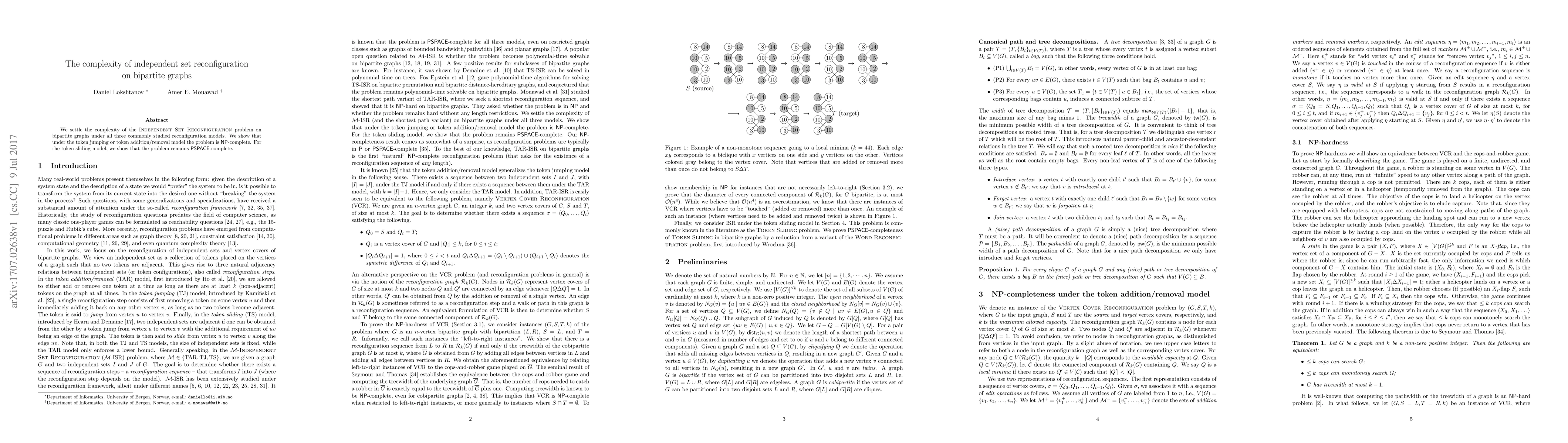 Summary: This paper resolves the complexity of Independent Set Reconfiguration on bipartite graphs, proving NP-completeness under token jumping or addition/removal models and PSPACE-completeness under the token sliding model.
