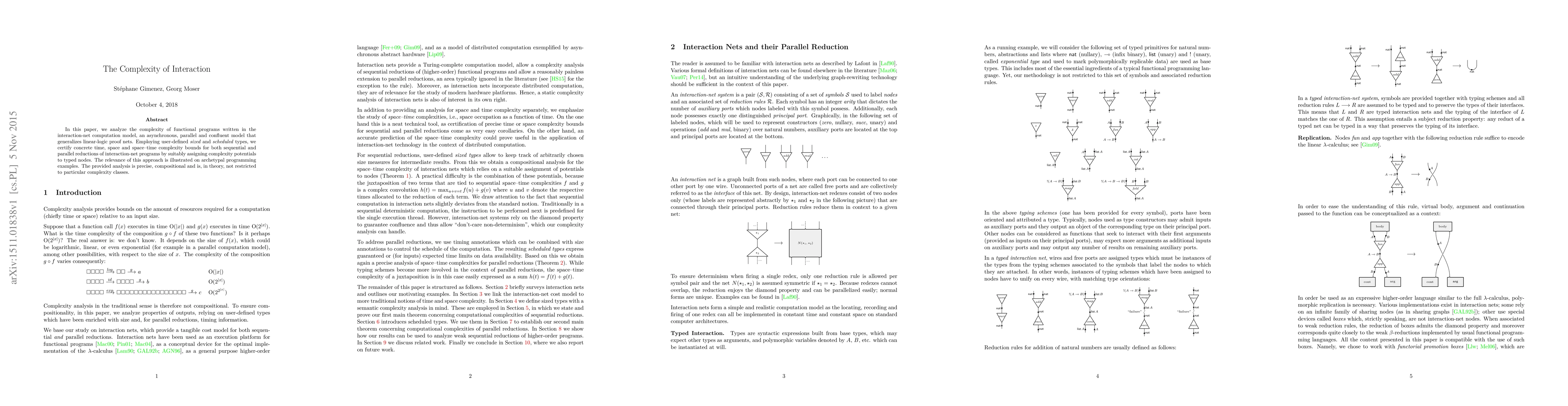 This paper analyzes the complexity of functional programs using an interaction-net computation model, providing precise time, space, and space-time complexity bounds for sequential and parallel reductions.
