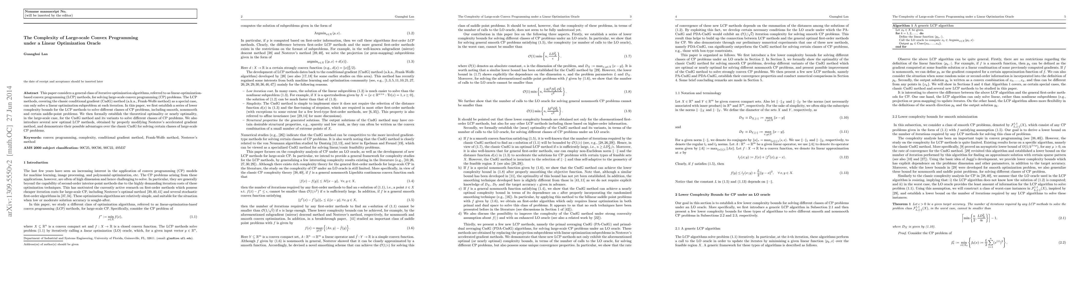 This paper considers a general class of iterative optimization algorithms, referred to as linear-optimization-based convex programming (LCP) methods, for solving large-scale convex programming (CP) problems. The LCP methods, covering the classic conditional gradient (CG) method (a.k.a., Frank-Wolfe method) as a special case, can only solve a linear optimization subproblem at each iteration. In this paper, we first establish a series of lower complexity bounds for the LCP methods to solve different classes of CP problems, including smooth, nonsmooth and certain saddle-point problems. We then formally establish the theoretical optimality or nearly optimality, in the large-scale case, for the CG method and its variants to solve different classes of CP problems. We also introduce several new optimal LCP methods, obtained by properly modifying Nesterov's accelerated gradient method, and demonstrate their possible advantages over the classic CG for solving certain classes of large-scale CP problems.