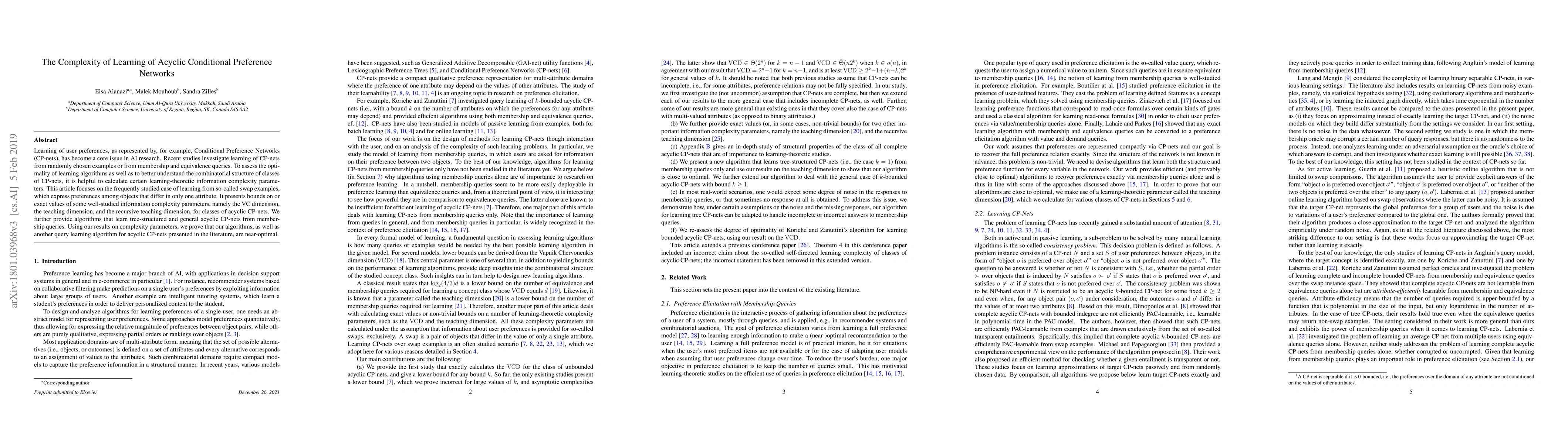 This paper investigates the learning complexity of acyclic Conditional Preference Networks (CP-nets) using swap examples, presenting bounds on learning-theoretic parameters like VC dimension and teaching dimension. It also introduces algorithms for learning these structures and assesses their optimality relative to existing methods.