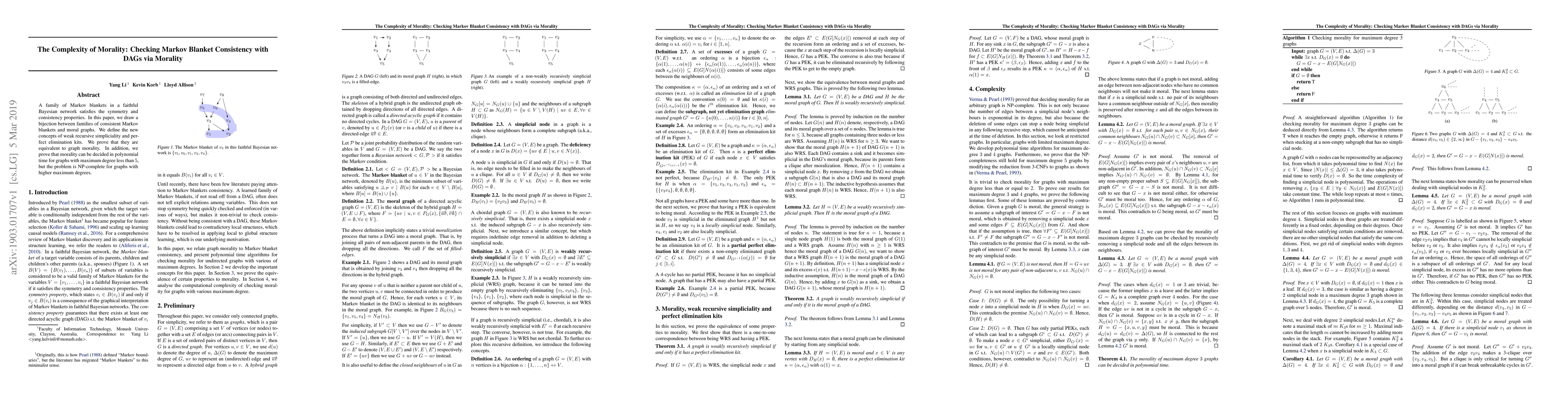 This research establishes a connection between Markov blanket consistency in Bayesian networks and moral graphs, introducing 'weak recursive simpliciality' and 'perfect elimination kits' as equivalent concepts. It proves morality decision-making is polynomial for graphs with max degree <5, but NP-complete for higher degrees.