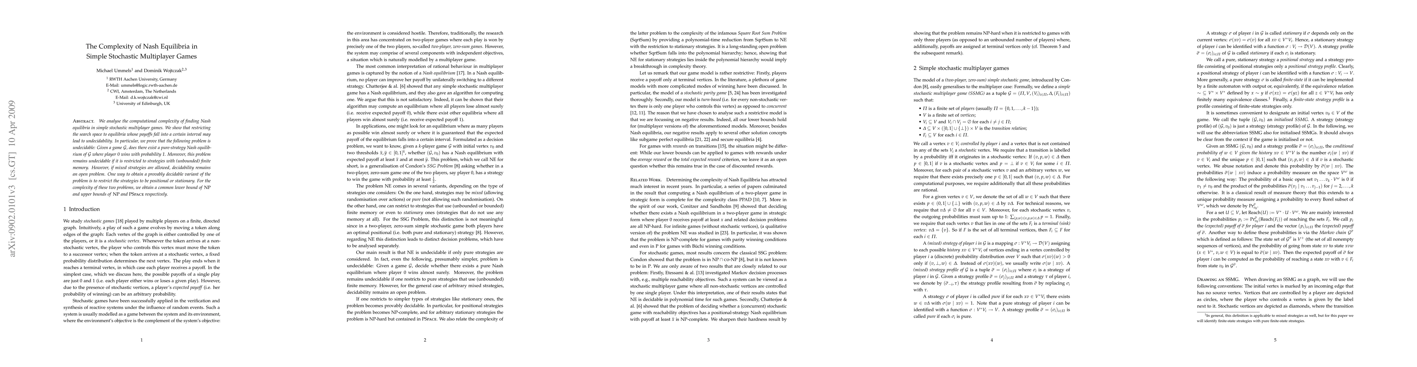 This paper investigates the computational complexity of finding Nash equilibria in simple stochastic multiplayer games, demonstrating that restricting the search to equilibria with payoffs in a specific interval can lead to undecidability. The problem of determining if a pure-strategy Nash equilibrium exists where player 0 wins with certainty remains undecidable, even with finite memory constraints. Allowing mixed strategies keeps decidability unresolved, but restricting strategies to positional or stationary ones provides decidable variants with complexity bounds of NP and PSPACE respectively.