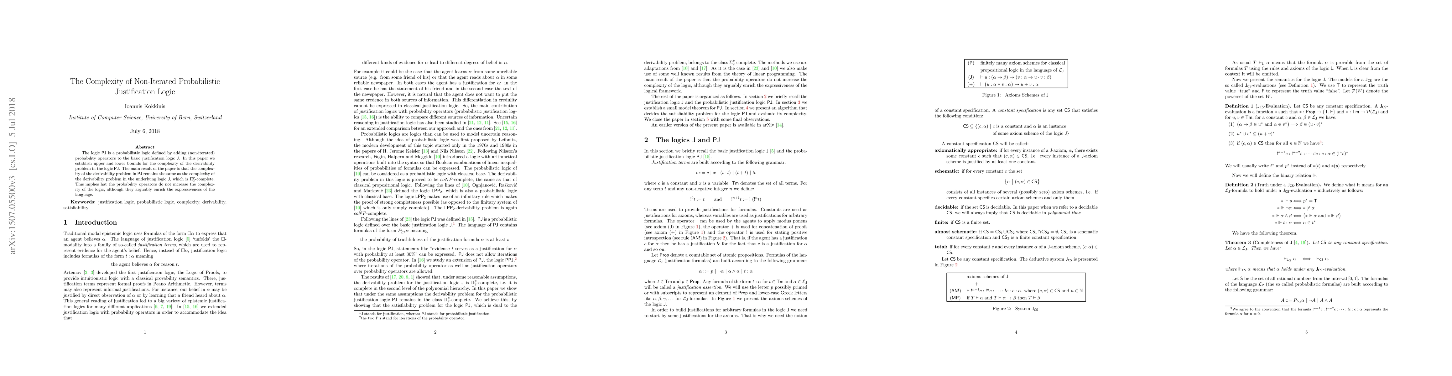 The logic PJ is a probabilistic logic defined by adding (non-iterated) probability operators to the basic justification logic J. In this paper we establish upper and lower bounds for the complexity of the derivability problem in the logic PJ. The main result of the paper is that the complex- ity of the derivability problem in PJ remains the same as the complexity of the derivability problem in the underlying logic J, which is {\Pi}p2-complete. This implies hat the probability operators do not increase the complex- ity of the logic, although they arguably enrich the expressiveness of the language.
