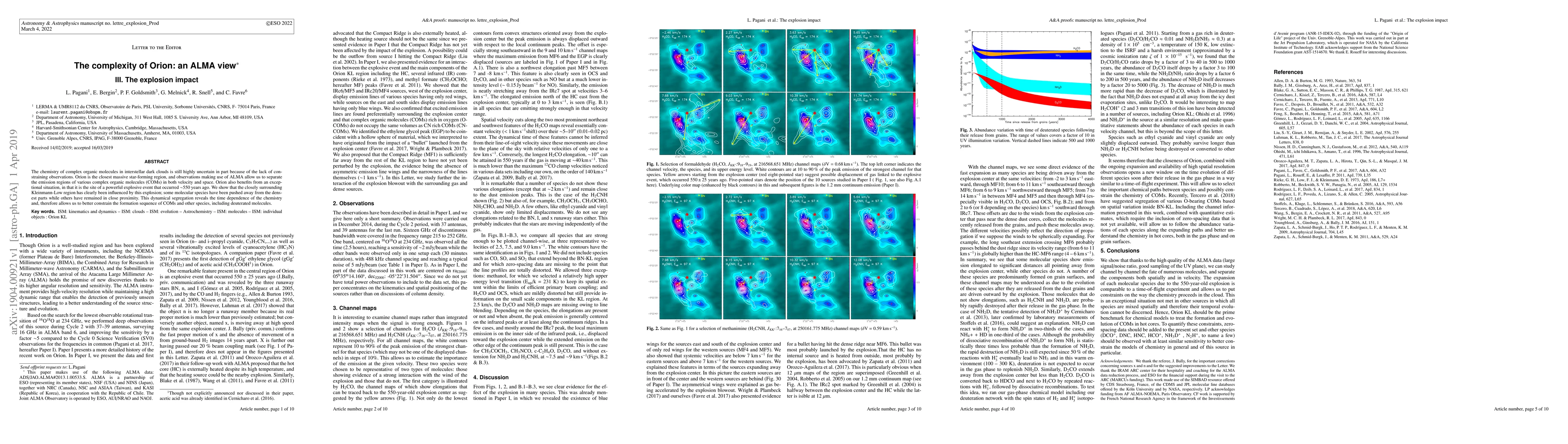 The chemistry of complex organic molecules in interstellar dark clouds is still highly uncertain in part because of the lack of constraining observations. Orion is the closest massive star-forming region, and observations making use of ALMA allow us to separate the emission regions of various complex organic molecules (COMs) in both velocity and space. Orion also benefits from an exceptional situation, in that it is the site of a powerful explosive event that occurred 550 years ago. We show that the closely surrounding Kleinmann-Low region has clearly been influenced by this explosion; some molecular species have been pushed away from the densest parts while others have remained in close proximity. This dynamical segregation reveals the time dependence of the chemistry and, therefore allows us to better constrain the formation sequence of COMs and other species, including deuterated molecules.