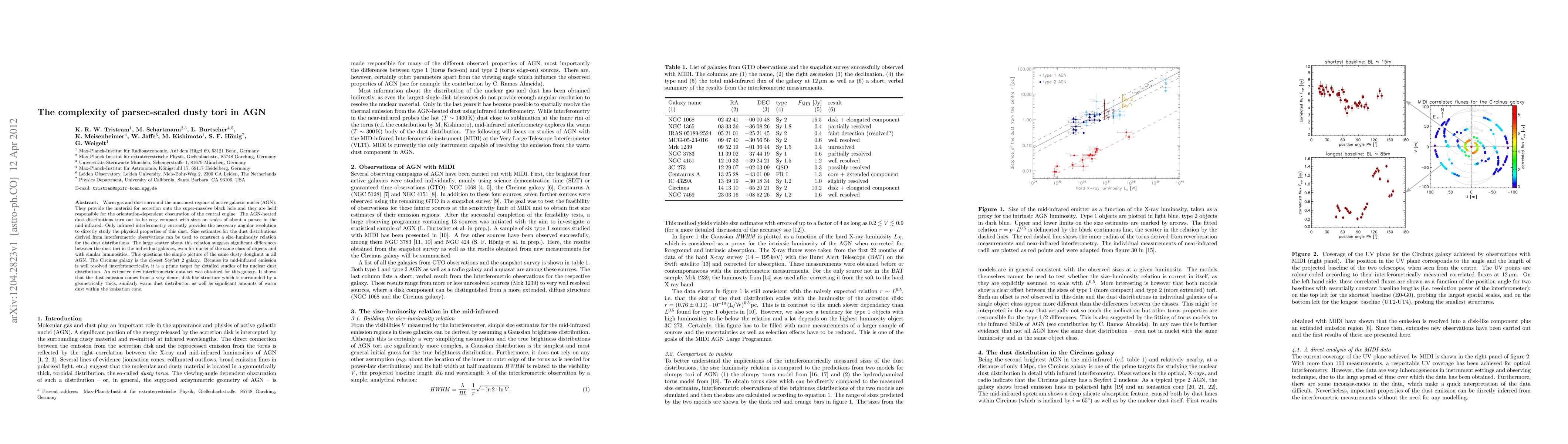 Warm gas and dust surround the innermost regions of active galactic nuclei (AGN). They provide the material for accretion onto the super-massive black hole and they are held responsible for the orientation-dependent obscuration of the central engine. The AGN-heated dust distributions turn out to be very compact with sizes on scales of about a parsec in the mid-infrared. Only infrared interferometry currently provides the necessary angular resolution to directly study the physical properties of this dust. Size estimates for the dust distributions derived from interferometric observations can be used to construct a size--luminosity relation for the dust distributions. The large scatter about this relation suggests significant differences between the dust tori in the individual galaxies, even for nuclei of the same class of objects and with similar luminosities. This questions the simple picture of the same dusty doughnut in all AGN. The Circinus galaxy is the closest Seyfert 2 galaxy. Because its mid-infrared emission is well resolved interferometrically, it is a prime target for detailed studies of its nuclear dust distribution. An extensive new interferometric data set was obtained for this galaxy. It shows that the dust emission comes from a very dense, disk-like structure which is surrounded by a geometrically thick, similarly warm dust distribution as well as significant amounts of warm dust within the ionisation cone.