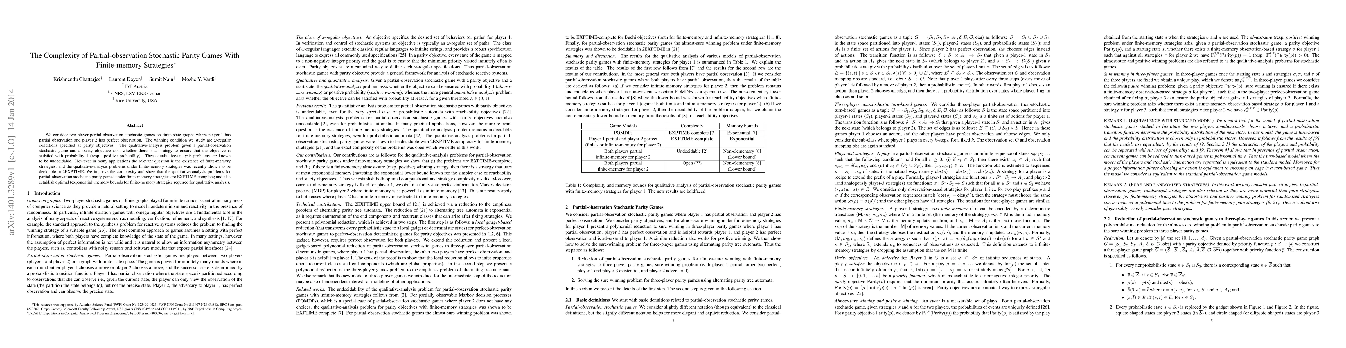 We consider two-player partial-observation stochastic games on finite-state graphs where player 1 has partial observation and player 2 has perfect observation. The winning condition we study are \omega-regular conditions specified as parity objectives. The qualitative-analysis problem given a partial-observation stochastic game and a parity objective asks whether there is a strategy to ensure that the objective is satisfied with probability~1 (resp. positive probability). These qualtitative-analysis problems are known to be undecidable. However in many applications the relevant question is the existence of finite-memory strategies, and the qualitative-analysis problems under finite-memory strategies was recently shown to be decidable in 2EXPTIME. We improve the complexity and show that the qualitative-analysis problems for partial-observation stochastic parity games under finite-memory strategies are EXPTIME-complete; and also establish optimal (exponential) memory bounds for finite-memory strategies required for qualitative analysis.
