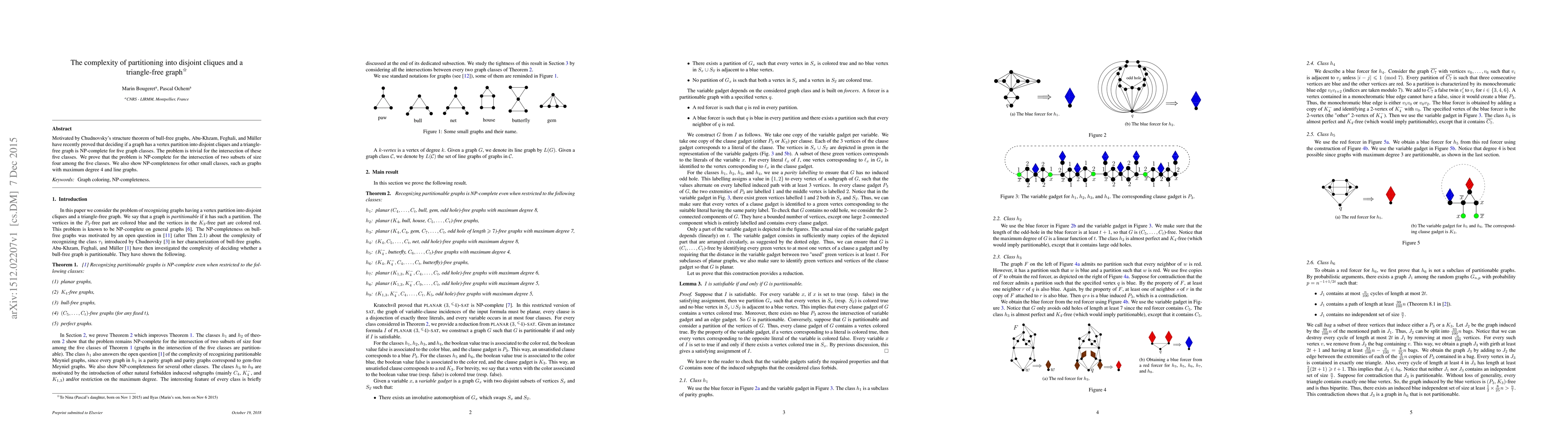 This research demonstrates that partitioning a graph into disjoint cliques and a triangle-free subgraph is NP-complete for several graph classes, including intersections of specific subsets and smaller classes like graphs with maximum degree 4 and line graphs. This extends previous findings on the complexity of similar partitioning problems.