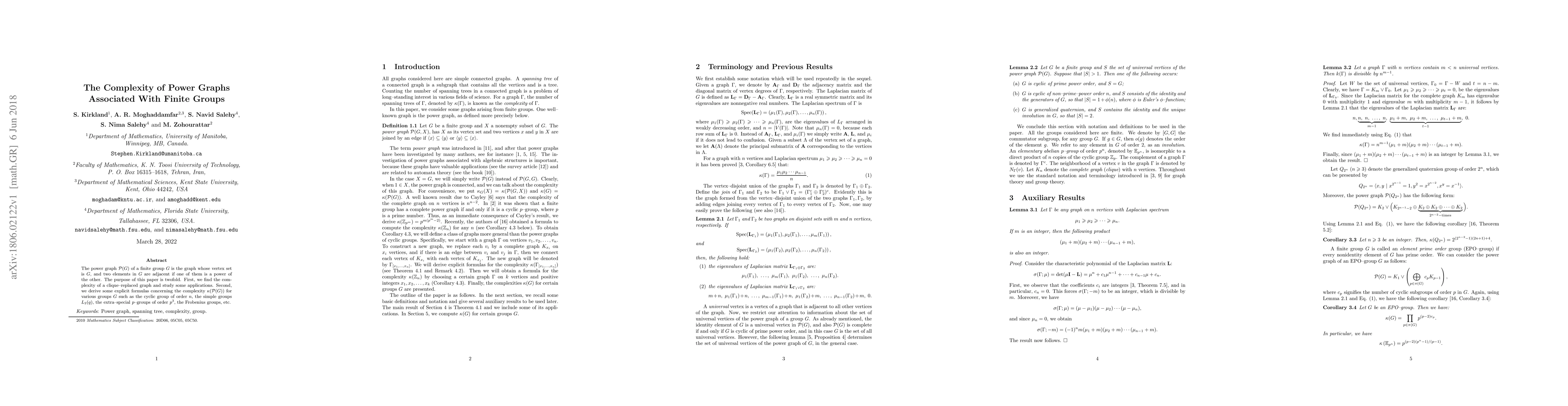 The power graph $\mathcal{P}(G)$ of a finite group $G$ is the graph whose vertex set is $G$, and two elements in $G$ are adjacent if one of them is a power of the other. The purpose of this paper is twofold. First, we find the complexity of a clique--replaced graph and study some applications. Second, we derive some explicit formulas concerning the complexity $\kappa(\mathcal{P}(G))$ for various groups $G$ such as the cyclic group of order $n$, the simple groups $L_2(q)$, the extra--special $p$--groups of order $p^3$, the Frobenius groups, etc.
