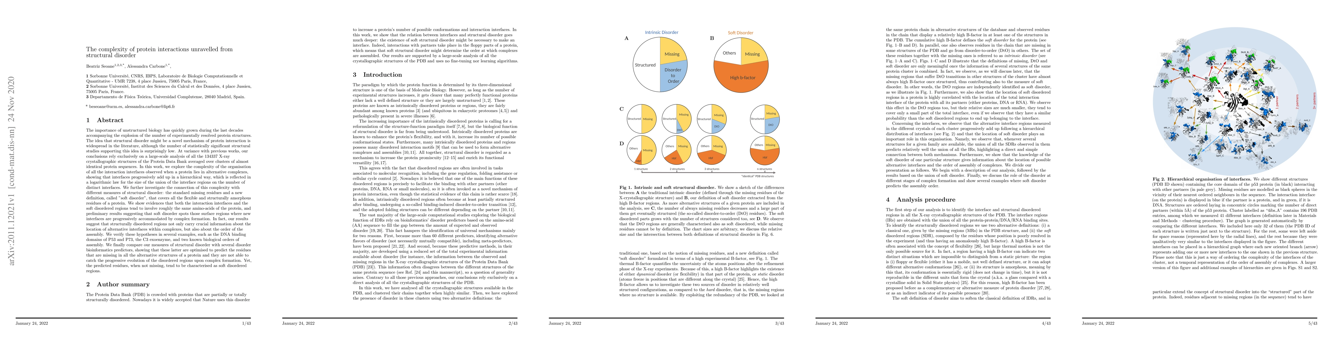 The idea that structural disorder might be a novel mechanism of protein interaction is widespread in the Literature, although the number of statistically significant structural studies supporting this is surprisingly low. At variance with previous works, our conclusions rely exclusively on a large-scale analysis of all the 134337 X-ray crystallographic structures of the Protein Data Bank averaged over clusters of almost identical protein sequences. In this work, we explore the complexity of the organization of all the interaction interfaces observed when a protein lies in alternative complexes, showing that interfaces progressively add up in a hierarchical way. We further investigate the connection of this complexity with different measures of structural disorder: the standard missing residues and a new definition, called "soft disorder", that covers all the flexible and structurally amorphous residues of a protein. We show evidences that both the interaction interfaces and the soft disordered regions tend to involve roughly the same amino-acids of the protein, and preliminary results suggesting that soft disorder spots those surface regions where new interfaces are progressively accommodated by complex formation. Our results suggest that disordered regions not only carry crucial information about the location of alternative interfaces within complexes, but also of the order of the assembly. We verify these hypotheses in several examples. We finally compare our measures of disorder with several disorder predictors, showing that these latter are optimized to predict the residues that are missing in all the alternative structures of a protein, and they are not able to catch the progressive evolution of the disordered regions upon complex formation. Yet, the predicted residues, if not missing, tend to be characterized as soft disordered.