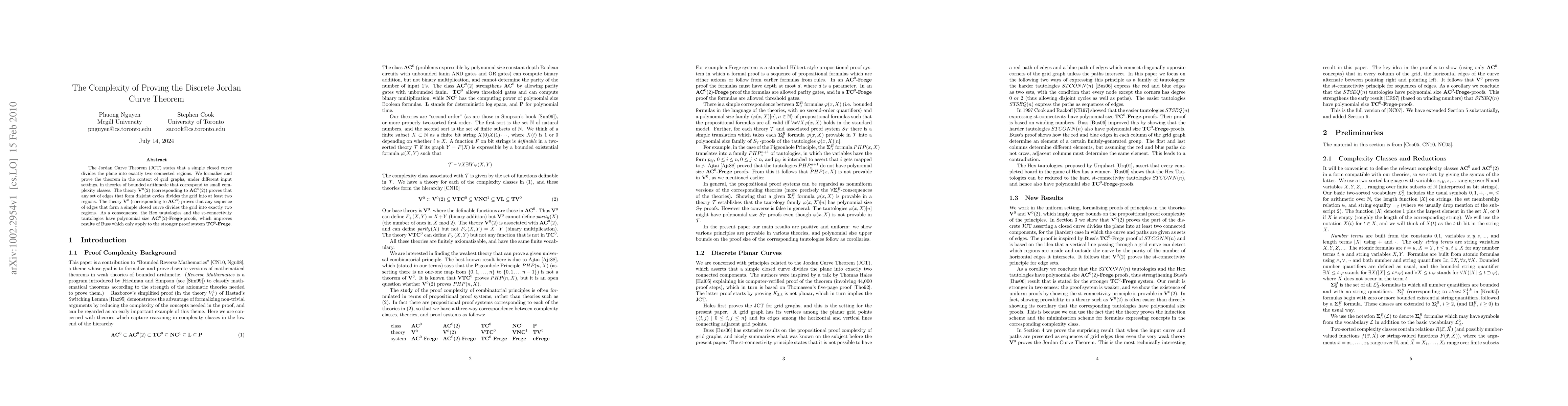 The paper formalizes and proves the Discrete Jordan Curve Theorem in grid graphs using bounded arithmetic theories, demonstrating that simple closed curves divide the plane into exactly two regions. It shows that $V^0(2)$ and $V^0$ theories provide polynomial size proofs, improving on prior results by Buss.