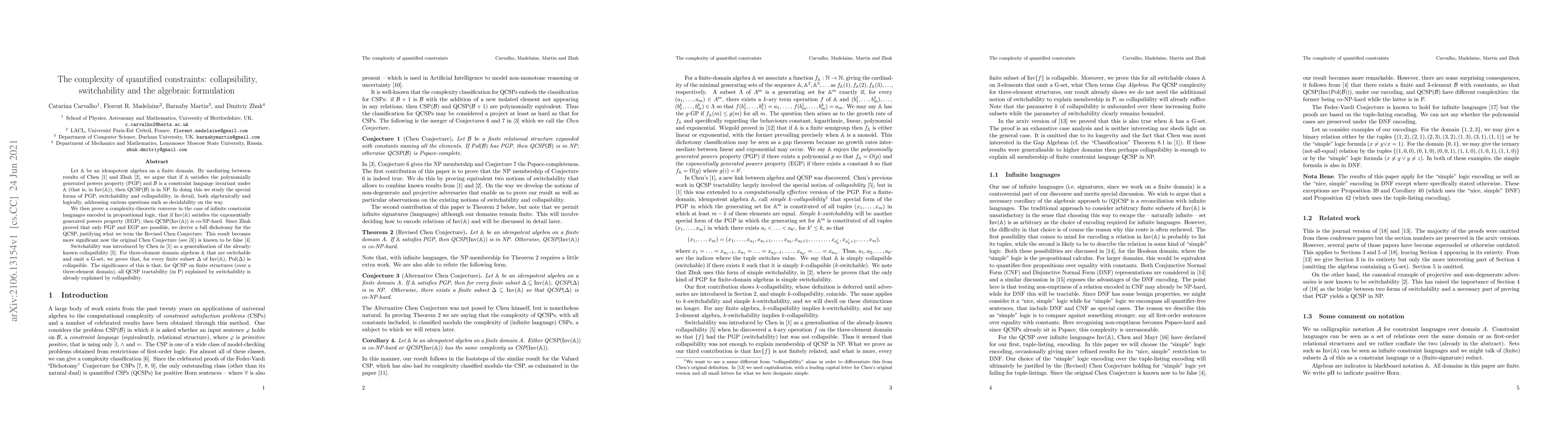 This paper investigates the complexity of quantified constraint satisfaction problems (QCSP) through algebraic properties like switchability and collapsibility. It establishes that if a constraint language is invariant under an idempotent algebra satisfying the polynomially generated powers property, then QCSP is in NP, and conversely, if it satisfies the exponentially generated powers property, QCSP is co-NP-hard, leading to a full complexity dichotomy for QCSP.