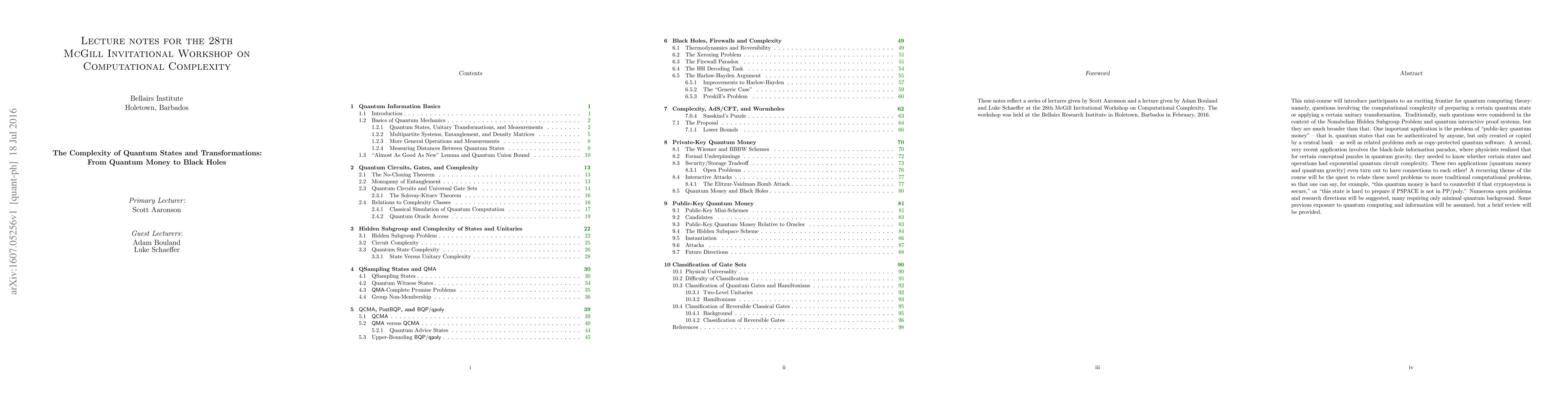 These are lecture notes from a weeklong course in quantum complexity theory taught at the Bellairs Research Institute in Barbados, February 21-25, 2016. The focus is quantum circuit complexity---i.e., the minimum number of gates needed to prepare a given quantum state or apply a given unitary transformation---as a unifying theme tying together several topics of recent interest in the field. Those topics include the power of quantum proofs and advice states; how to construct quantum money schemes secure against counterfeiting; and the role of complexity in the black-hole information paradox and the AdS/CFT correspondence (through connections made by Harlow-Hayden, Susskind, and others). The course was taught to a mixed audience of theoretical computer scientists and quantum gravity / string theorists, and starts out with a crash course on quantum information and computation in general.