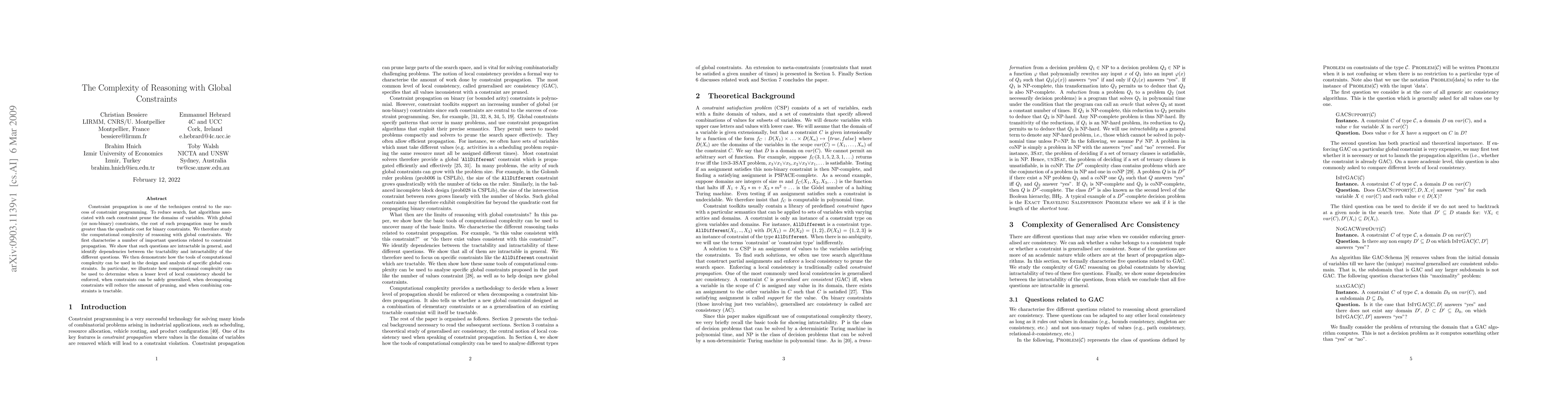 This paper investigates the computational complexity of reasoning with global constraints in constraint programming. It demonstrates that global constraint propagation is often more complex than binary constraints, explores related questions about constraint propagation, and shows their general intractability while identifying interdependencies. The study uses computational complexity theory to guide the design and analysis of specific global constraints, providing insights on enforcing consistency, generalization, decomposition, and combination.