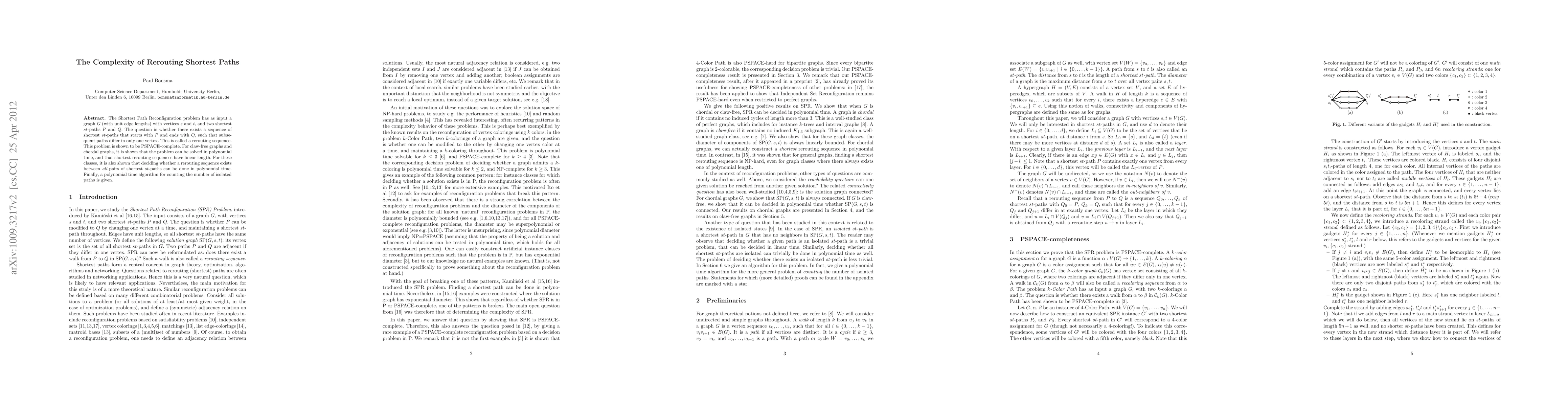 The Shortest Path Reconfiguration problem has as input a graph G (with unit edge lengths) with vertices s and t, and two shortest st-paths P and Q. The question is whether there exists a sequence of shortest st-paths that starts with P and ends with Q, such that subsequent paths differ in only one vertex. This is called a rerouting sequence. This problem is shown to be PSPACE-complete. For claw-free graphs and chordal graphs, it is shown that the problem can be solved in polynomial time, and that shortest rerouting sequences have linear length. For these classes, it is also shown that deciding whether a rerouting sequence exists between all pairs of shortest st-paths can be done in polynomial time. Finally, a polynomial time algorithm for counting the number of isolated paths is given.