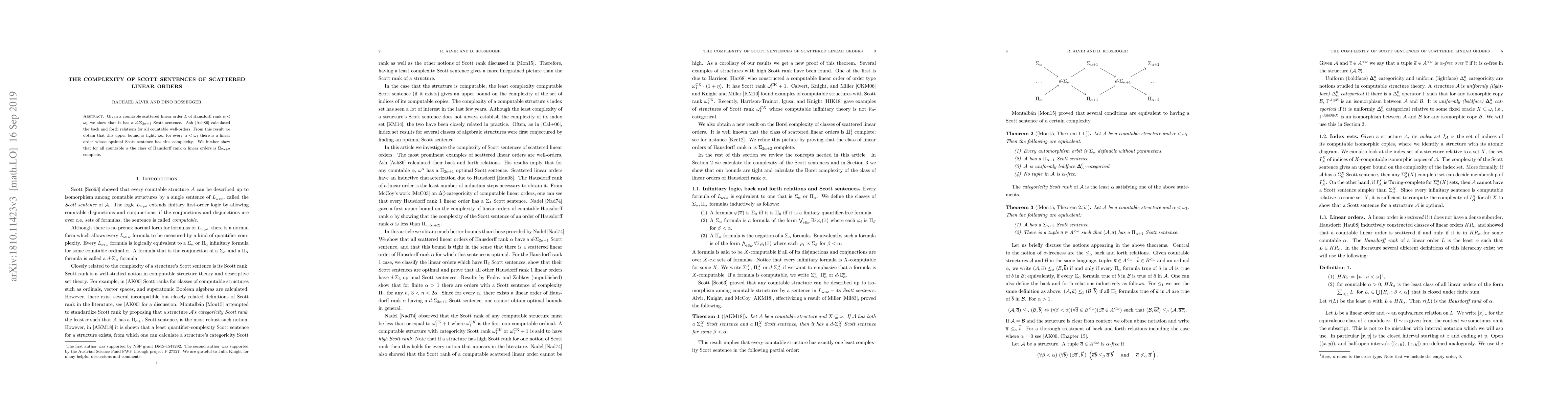 This paper demonstrates that countable scattered linear orders of Hausdorff rank $\alpha < \omega_1$ possess a $d\text{-}\Sigma_{2\alpha+1}$ Scott sentence, with the upper bound proven tight through Ash's analysis of well-orders. Additionally, it establishes $\Sigma_{2\alpha+2}$ completeness for the class of Hausdorff rank $\alpha$ linear orders.