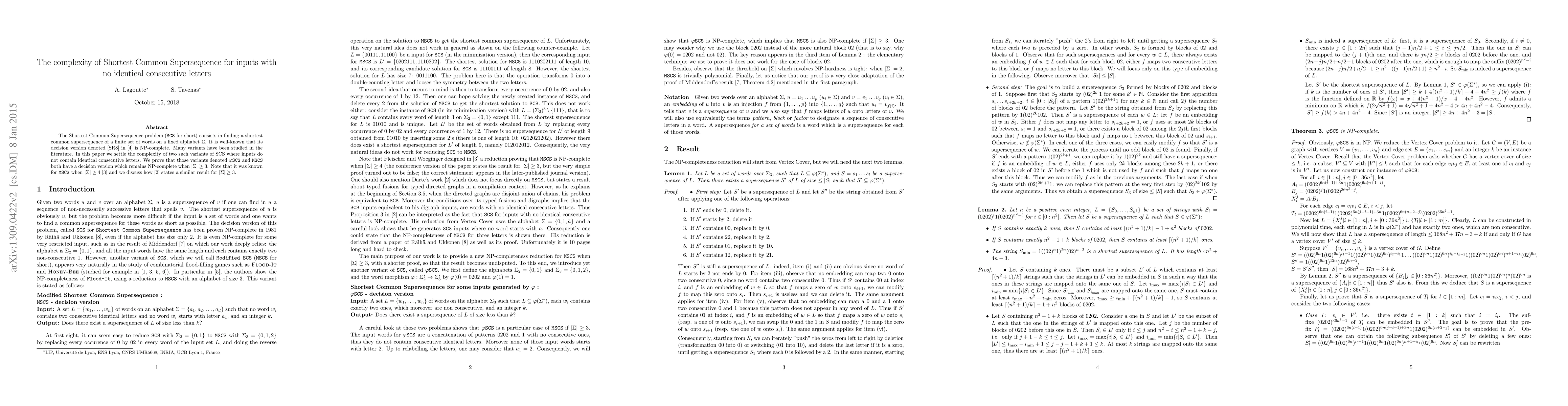 Two variants of the Shortest Common Supersequence problem have been found to remain NP-complete for inputs without identical consecutive letters when the alphabet size is at least 3.