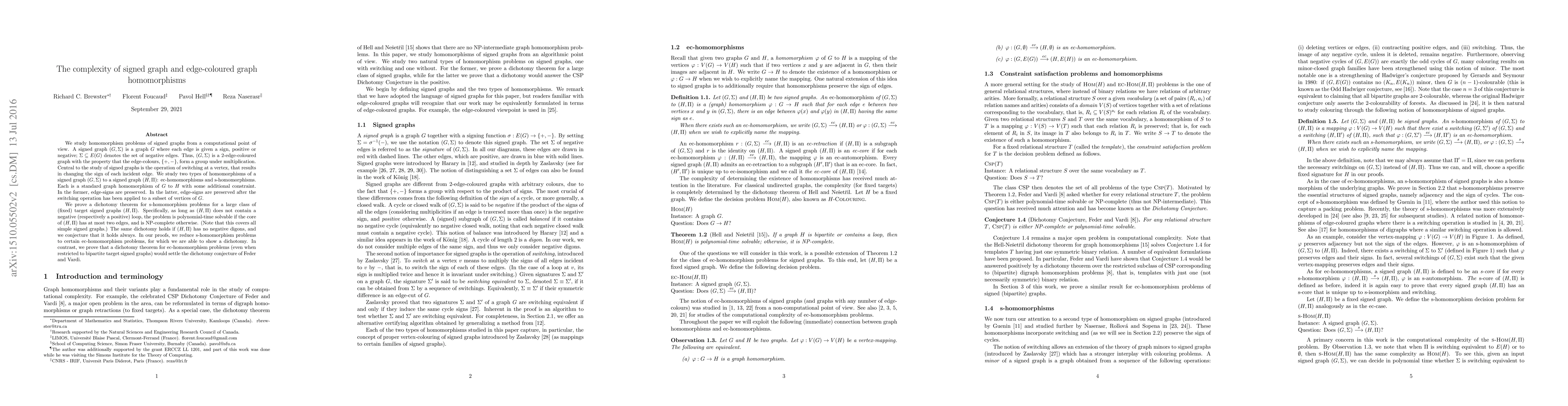 This paper explores computational complexity in signed graph homomorphisms, specifically ec-homomorphisms and s-homomorphisms. It proves a dichotomy theorem showing that s-homomorphism problems are polynomial-time solvable if the target graph has a simple structure, or NP-complete otherwise, and conjectures this holds universally.