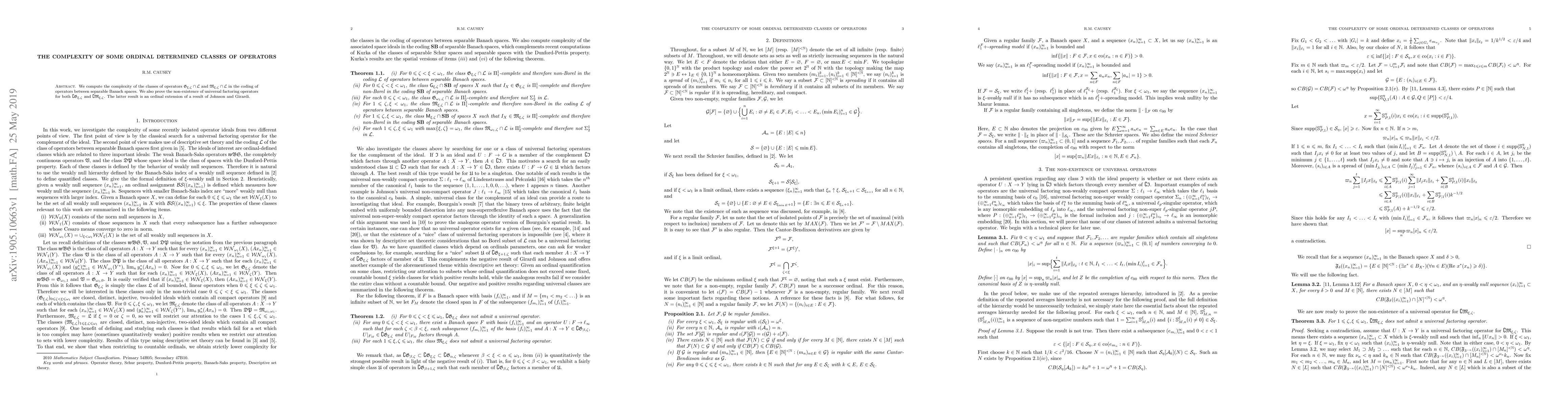 We compute the complexity of the classes of operators $\mathfrak{G}_{\xi, \zeta}\cap \mathcal{L}$ and $\mathfrak{M}_{\xi, \zeta}\cap \mathcal{L}$ in the coding of operators between separable Banach spaces. We also prove the non-existence of universal factoring operators for both $\complement \mathfrak{G}_{\xi, \zeta}$ and $\complement \mathfrak{M}_{\xi, \zeta}$. The latter result is an ordinal extension of a result of Johnson and Girardi.