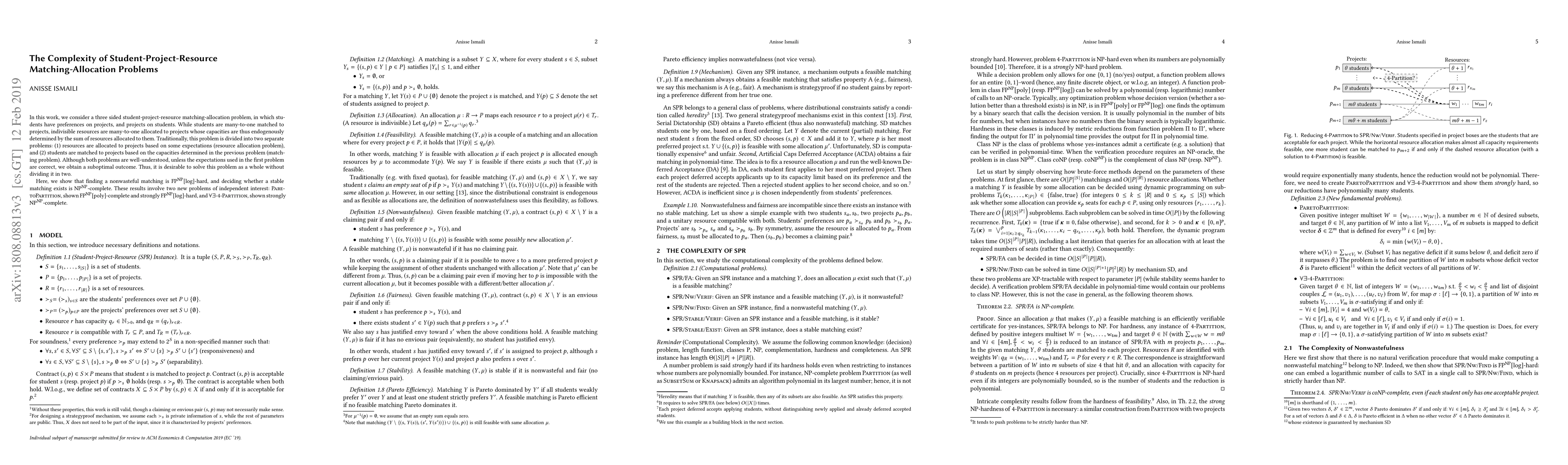 I settle the computational complexity of student-project-resource matching-allocation problems, in which students and resources are assigned to projects \citep{pc2017}. A project's capacity for students is endogenously determined by the resources allocated to it. I show that finding a nonwasteful matching is $\text{FP}^{\text{NP}}[\text{log}]$-hard, and deciding a stable matching is $\text{NP}^{\text{NP}}$-complete. To obtain these results, I introduce two new problems: (i) \textsc{ParetoPartition}, shown $\text{FP}^{\text{NP}}[\text{poly}]$-hard and also strongly $\text{FP}^{\text{NP}}[\text{log}]$-hard, and (ii) \textsc{$\forall\exists$-4-Partition}, shown strongly $\text{NP}^{\text{NP}}$-complete.