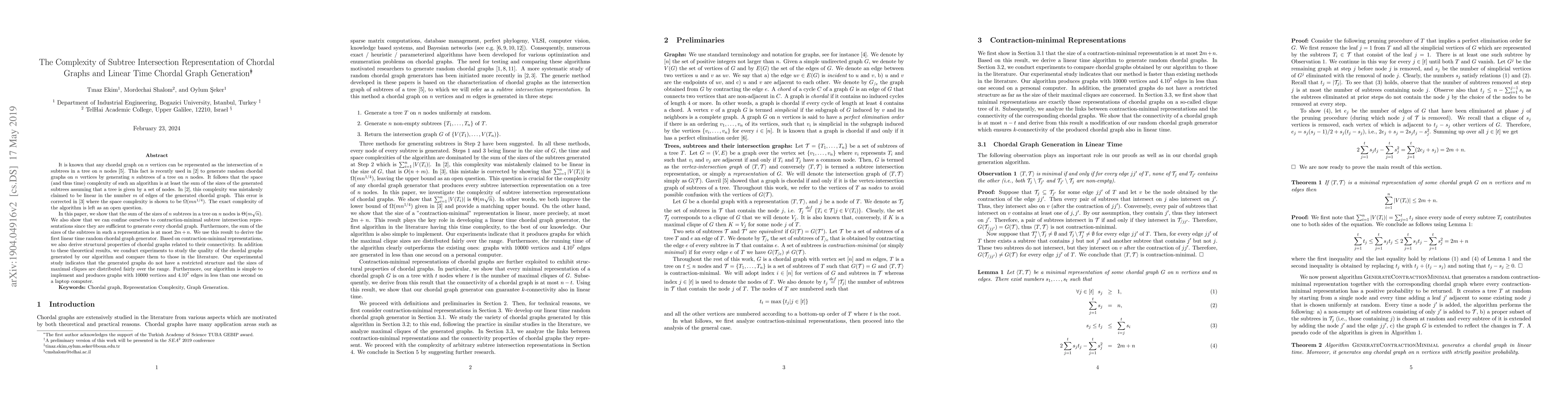 This paper corrects a complexity error in chordal graph generation algorithms, showing that the sum of subtree sizes is $\Theta(m\sqrt{n})$. It introduces a linear time random chordal graph generator based on contraction-minimal subtree intersection representations, proving their sufficiency for generating all chordal graphs and deriving structural properties related to connectivity. Experimental results show the algorithm's efficiency and the diverse structure of generated graphs.