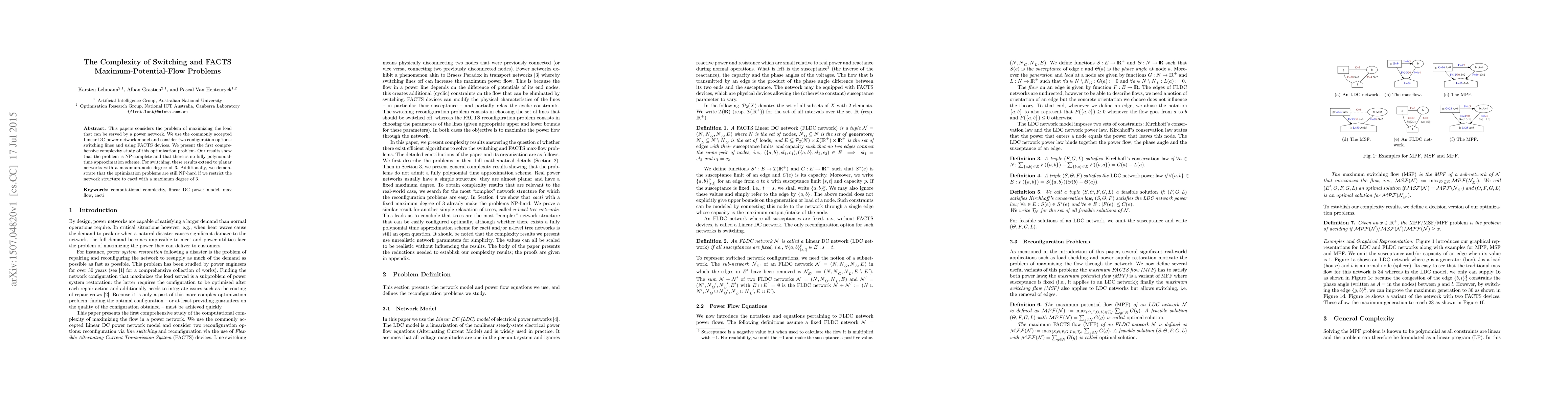 Researchers found that maximizing load in power networks with switching lines or FACTS devices is NP-complete and cannot be solved efficiently. This means that solving the problem exactly for large networks may require extremely long computing times.