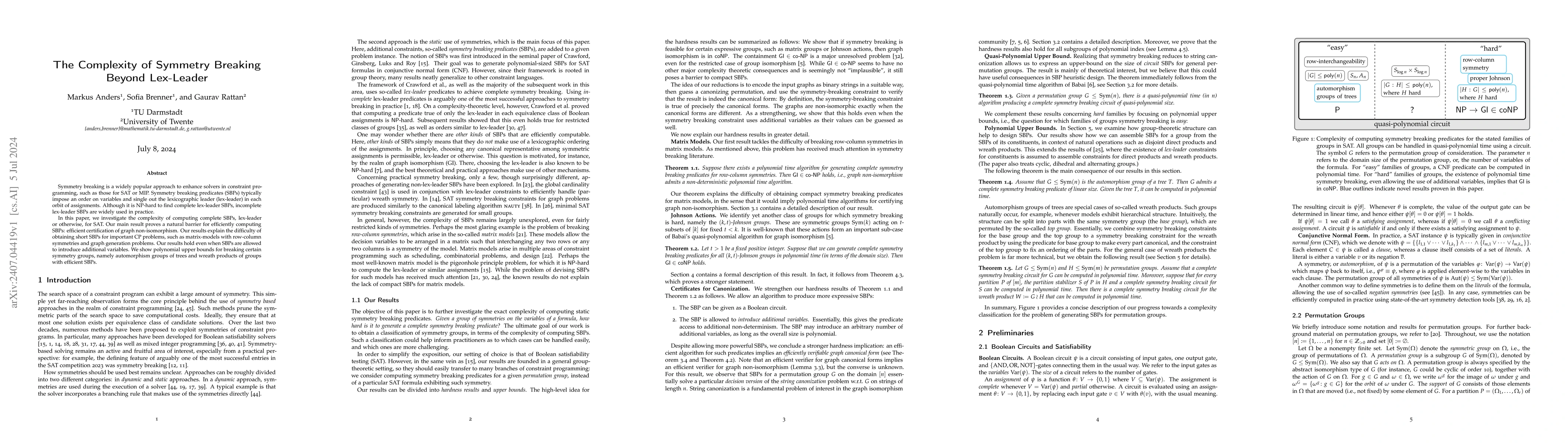 This paper explores the complexity of computing symmetry breaking predicates (SBPs) for SAT solvers, demonstrating a natural computational barrier tied to graph non-isomorphism certification. It highlights the difficulty in obtaining short SBPs for certain constraint programming problems, while providing polynomial bounds for specific symmetry groups like tree automorphisms.
