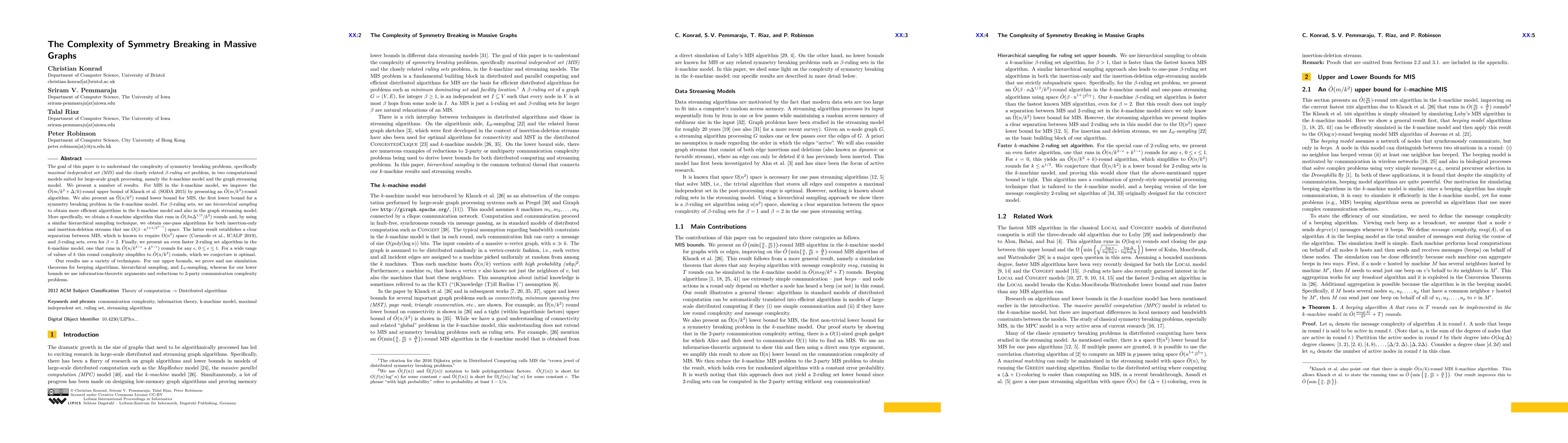 The goal of this paper is to understand the complexity of symmetry breaking problems, specifically maximal independent set (MIS) and the closely related $\beta$-ruling set problem, in two computational models suited for large-scale graph processing, namely the $k$-machine model and the graph streaming model. We present a number of results. For MIS in the $k$-machine model, we improve the $\tilde{O}(m/k^2 + \Delta/k)$-round upper bound of Klauck et al. (SODA 2015) by presenting an $\tilde{O}(m/k^2)$-round algorithm. We also present an $\tilde{\Omega}(n/k^2)$ round lower bound for MIS, the first lower bound for a symmetry breaking problem in the $k$-machine model. For $\beta$-ruling sets, we use hierarchical sampling to obtain more efficient algorithms in the $k$-machine model and also in the graph streaming model. More specifically, we obtain a $k$-machine algorithm that runs in $\tilde{O}(\beta n\Delta^{1/\beta}/k^2)$ rounds and, by using a similar hierarchical sampling technique, we obtain one-pass algorithms for both insertion-only and insertion-deletion streams that use $O(\beta \cdot n^{1+1/2^{\beta-1}})$ space. The latter result establishes a clear separation between MIS, which is known to require $\Omega(n^2)$ space (Cormode et al., ICALP 2019), and $\beta$-ruling sets, even for $\beta = 2$. Finally, we present an even faster 2-ruling set algorithm in the $k$-machine model, one that runs in $\tilde{O}(n/k^{2-\epsilon} + k^{1-\epsilon})$ rounds for any $\epsilon$, $0 \le \epsilon \le 1$.