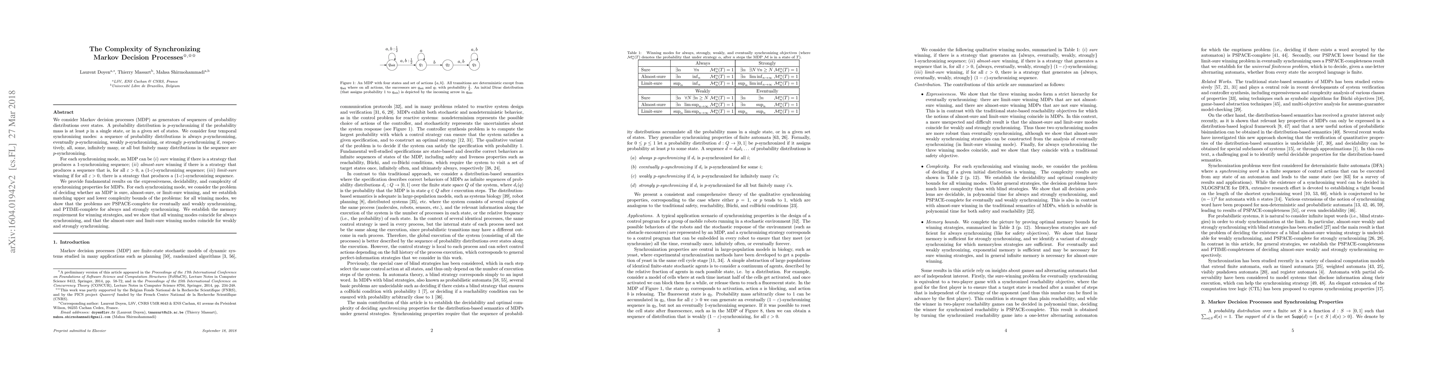 This paper investigates the complexity of synchronizing Markov decision processes (MDPs) through various temporal modes: always, eventually, weakly, and strongly synchronizing. It establishes the decidability and complexity of determining whether an MDP is sure, almost-sure, or limit-sure winning, showing PSPACE-complete and PTIME-complete complexities for different synchronizing modes.