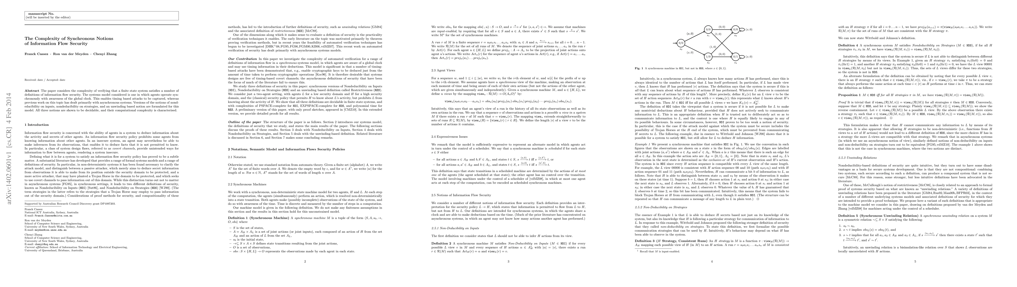 Researchers have developed a framework to verify information flow security in synchronous systems, showing that three key notions are decidable and their complexity can be characterized. This work enables the capture of timing-based attacks and expands on previous models focused on asynchronous systems.