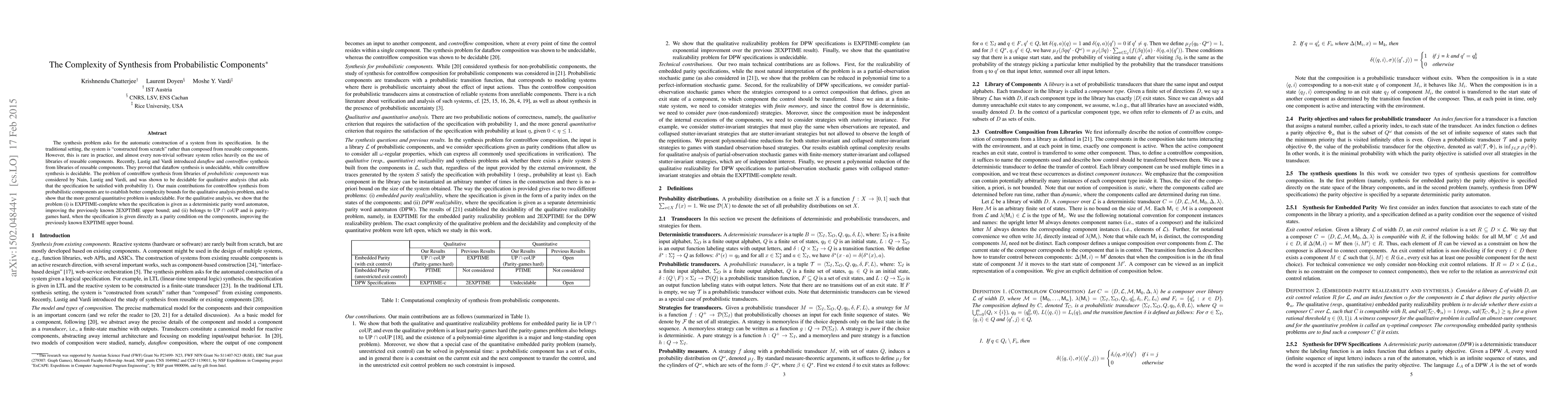 This paper explores the complexity of synthesizing systems from probabilistic components, establishing better complexity bounds for qualitative analysis and proving the undecidability of the more general quantitative synthesis problem. It shows that qualitative synthesis from probabilistic components is EXPTIME-complete under certain specifications.