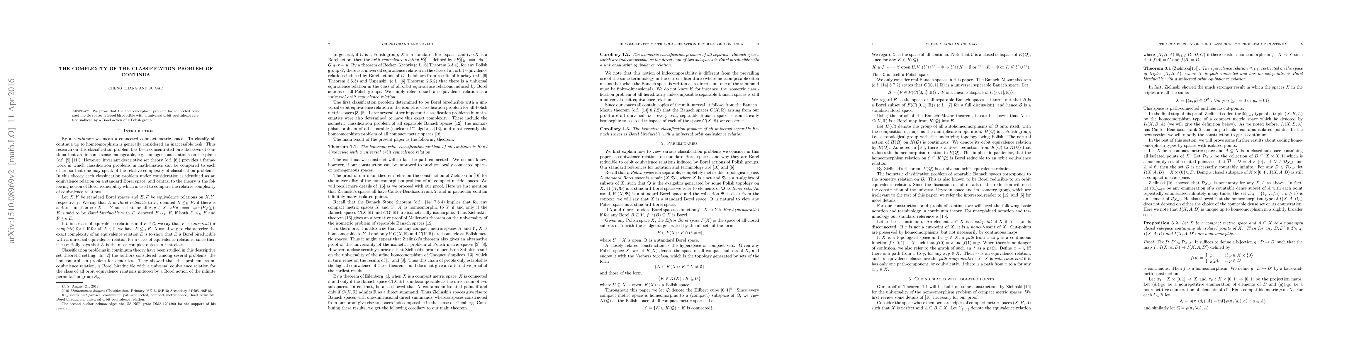 We prove that the homeomorphism problem for connected compact metric spaces is Borel bireducible with a universal orbit equivalence relation induced by a Borel action of a Polish group.