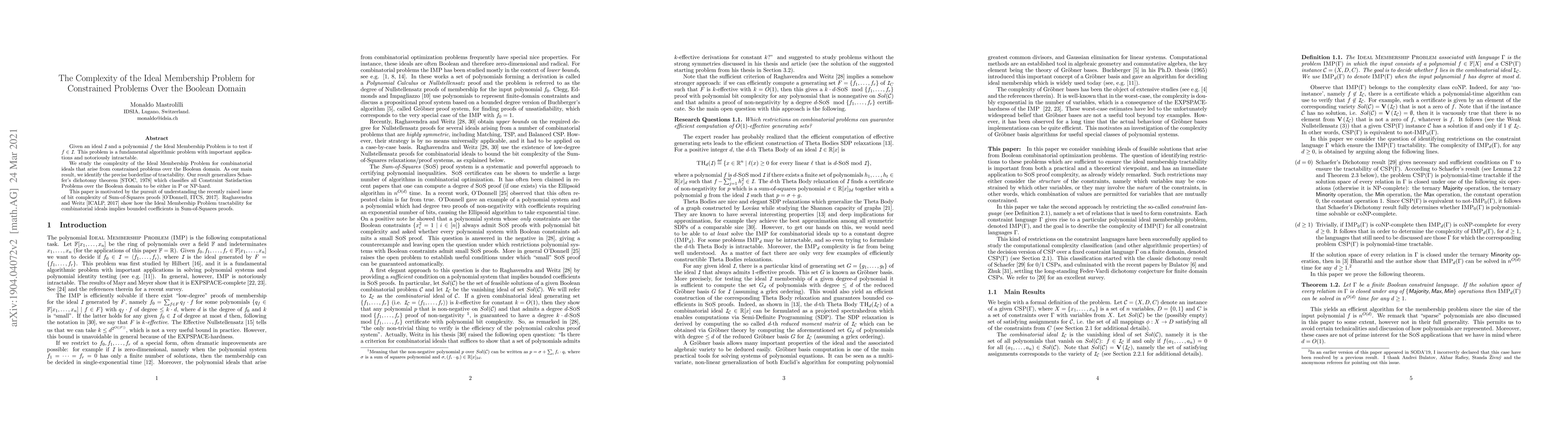 This paper explores the complexity of the Ideal Membership Problem for combinatorial ideals from Boolean domain constrained problems, identifying the threshold for tractability using Gröbner bases techniques. It extends Schaefer's dichotomy theorem and provides conditions for efficient computation of Theta Body SDP relaxations, addressing the bit complexity of Sum-of-Squares proofs.
