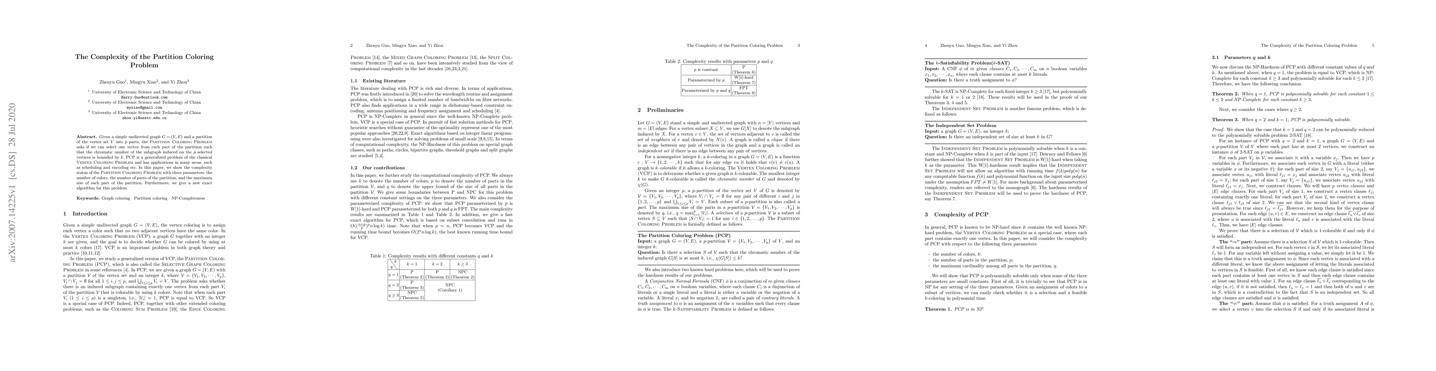 This paper establishes the complexity of the Partition Coloring Problem (PCP), a generalization of the Vertex Coloring Problem, considering the number of colors, partition parts, and part sizes. It also presents a novel exact algorithm for solving PCP, which has applications in scheduling and encoding.