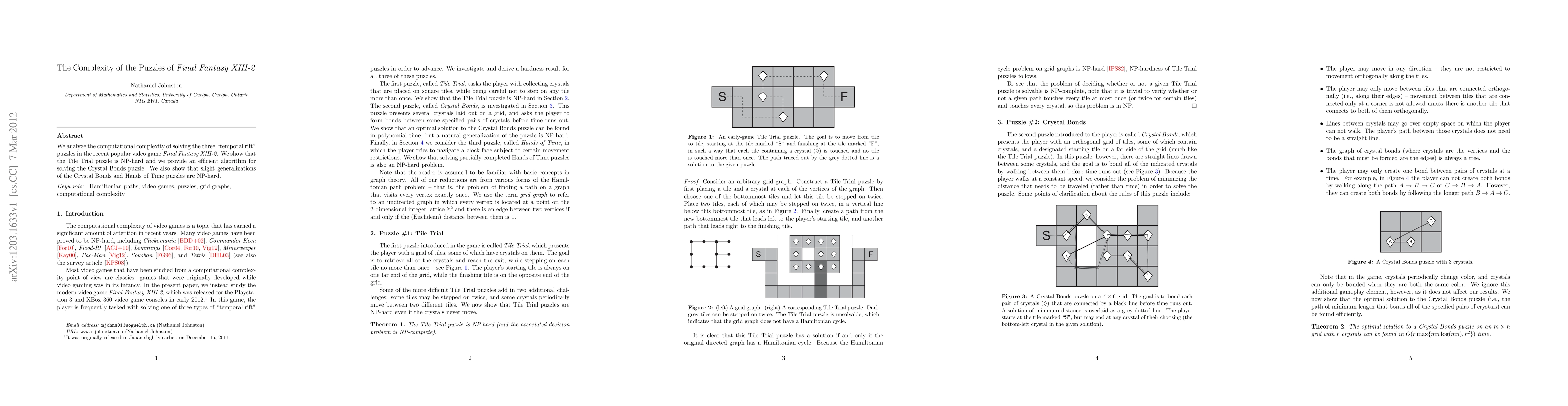 This paper examines the computational complexity of three puzzles in Final Fantasy XIII-2, demonstrating that the Tile Trial puzzle is NP-hard, providing an efficient algorithm for the Crystal Bonds puzzle, and showing that generalized versions of the Crystal Bonds and Hands of Time puzzles are also NP-hard.